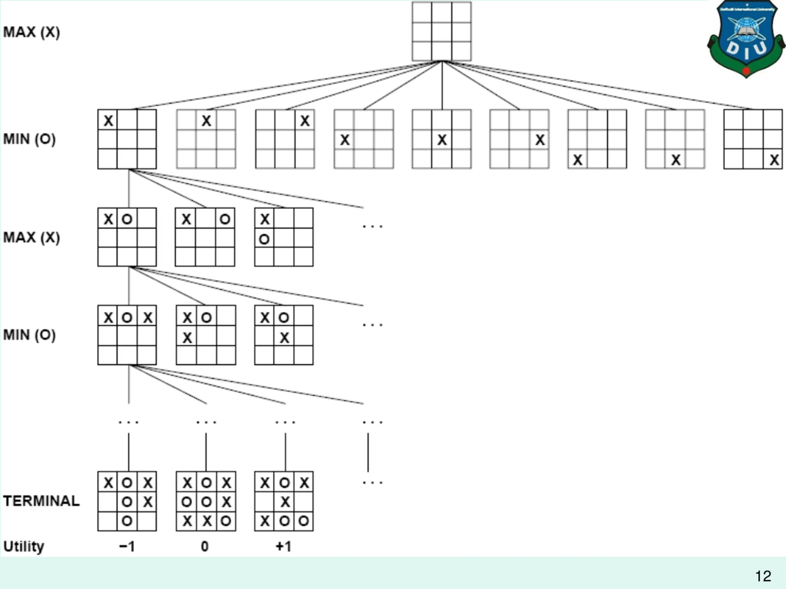Greedy Search Game Playing ? A utility function maps each terminal state of the board to a numeric value corresponding to the value of that state to the computer. positive for winning, > + means better for computer negative for losing, > - means better for opponent zero for a draw typical values (lost to win): -infinity to +infinity -1.0 to +1.0 11