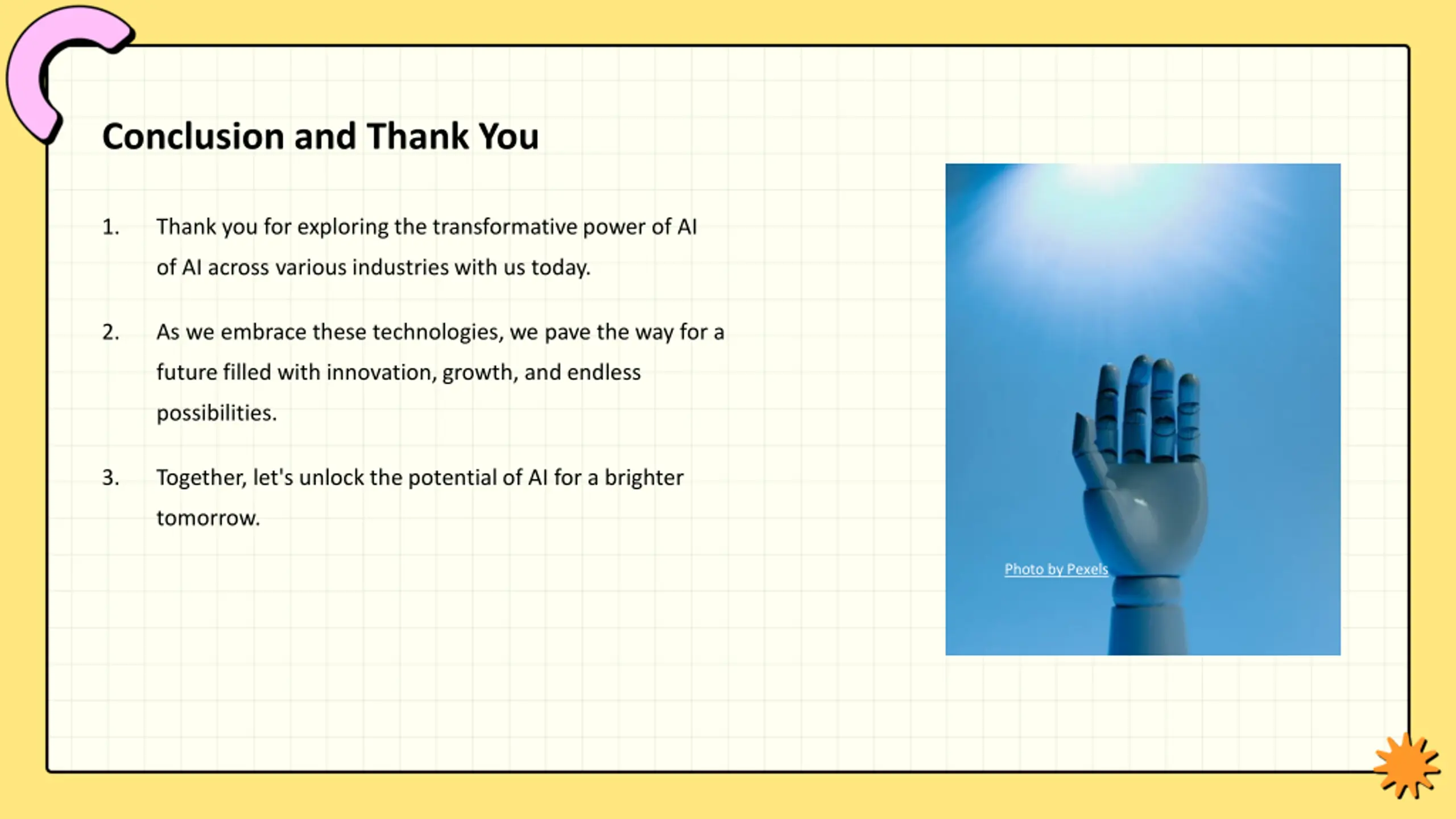 Conclusion and Thank You 1. Thank you for exploring the transformative power of AI of AI across various industries with us today. 2. As we embrace these technologies, we pave the way for a future filled with innovation, growth, and endless possibilities. 3. Together, let's unlock the potential of AI for a brighter tomorrow. Photo by Pexels