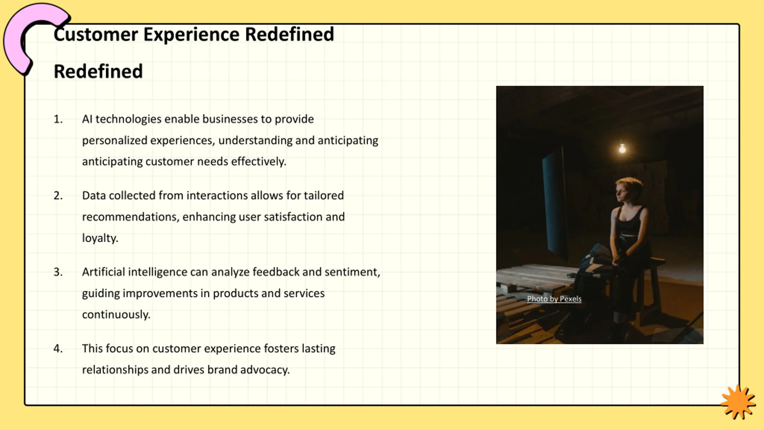 Customer Experience Redefined Redefined 1. AI technologies enable businesses to provide personalized experiences, understanding and anticipating anticipating customer needs effectively. 2. Data collected from interactions allows for tailored recommendations, enhancing user satisfaction and loyalty. 3. Artificial intelligence can analyze feedback and sentiment, guiding improvements in products and services Photo by Pexels continuously. 4. This focus on customer experience fosters lasting relationships and drives brand advocacy.