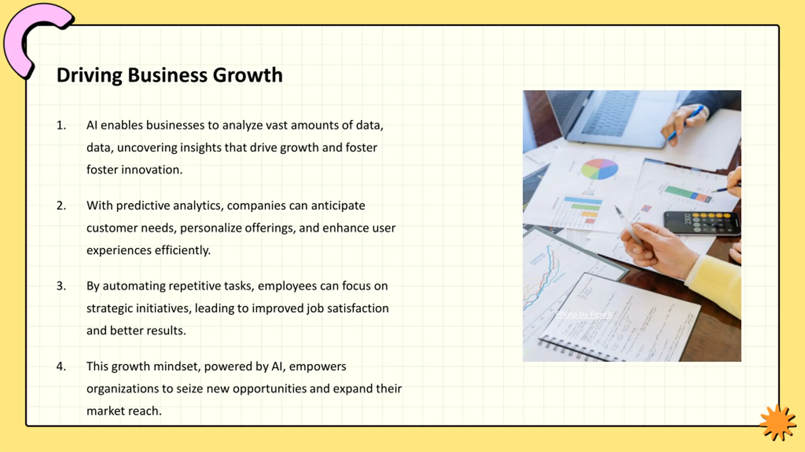 Driving Business Growth 1. AI enables businesses to analyze vast amounts of data, data, uncovering insights that drive growth and foster foster innovation. 2. With predictive analytics, companies can anticipate customer needs, personalize offerings, and enhance user experiences efficiently. 3. By automating repetitive tasks, employees can focus on strategic initiatives, leading to improved job satisfaction Photo by Pexels and better results. 4. This growth mindset, powered by AI, empowers organizations to seize new opportunities and expand their market reach.