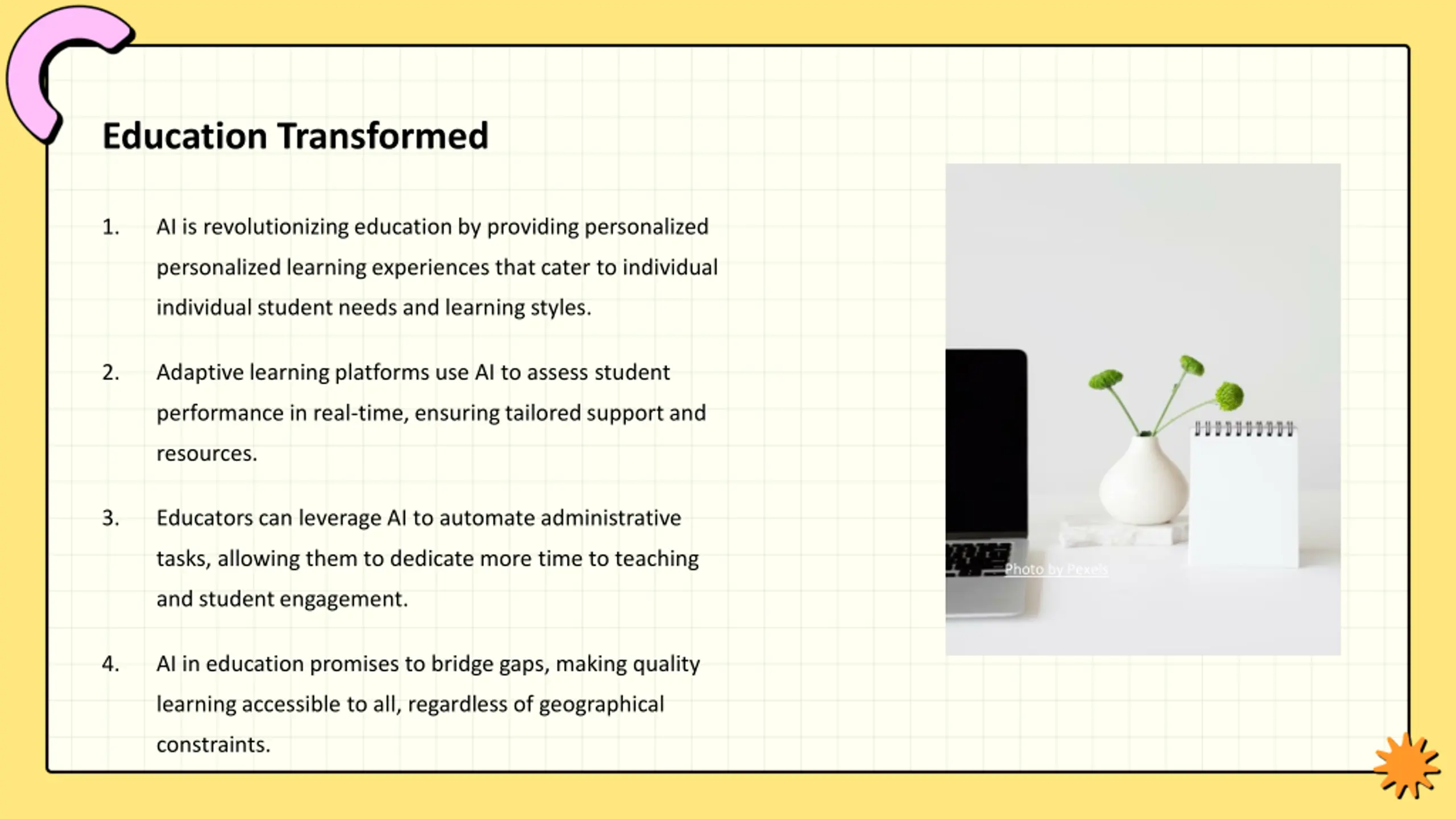 Education Transformed 1. AI is revolutionizing education by providing personalized personalized learning experiences that cater to individual individual student needs and learning styles. 2. Adaptive learning platforms use AI to assess student performance in real-time, ensuring tailored support and resources. 3. Educators can leverage AI to automate administrative tasks, allowing them to dedicate more time to teaching Photo by Pexels and student engagement. 4. AI in education promises to bridge gaps, making quality learning accessible to all, regardless of geographical constraints.