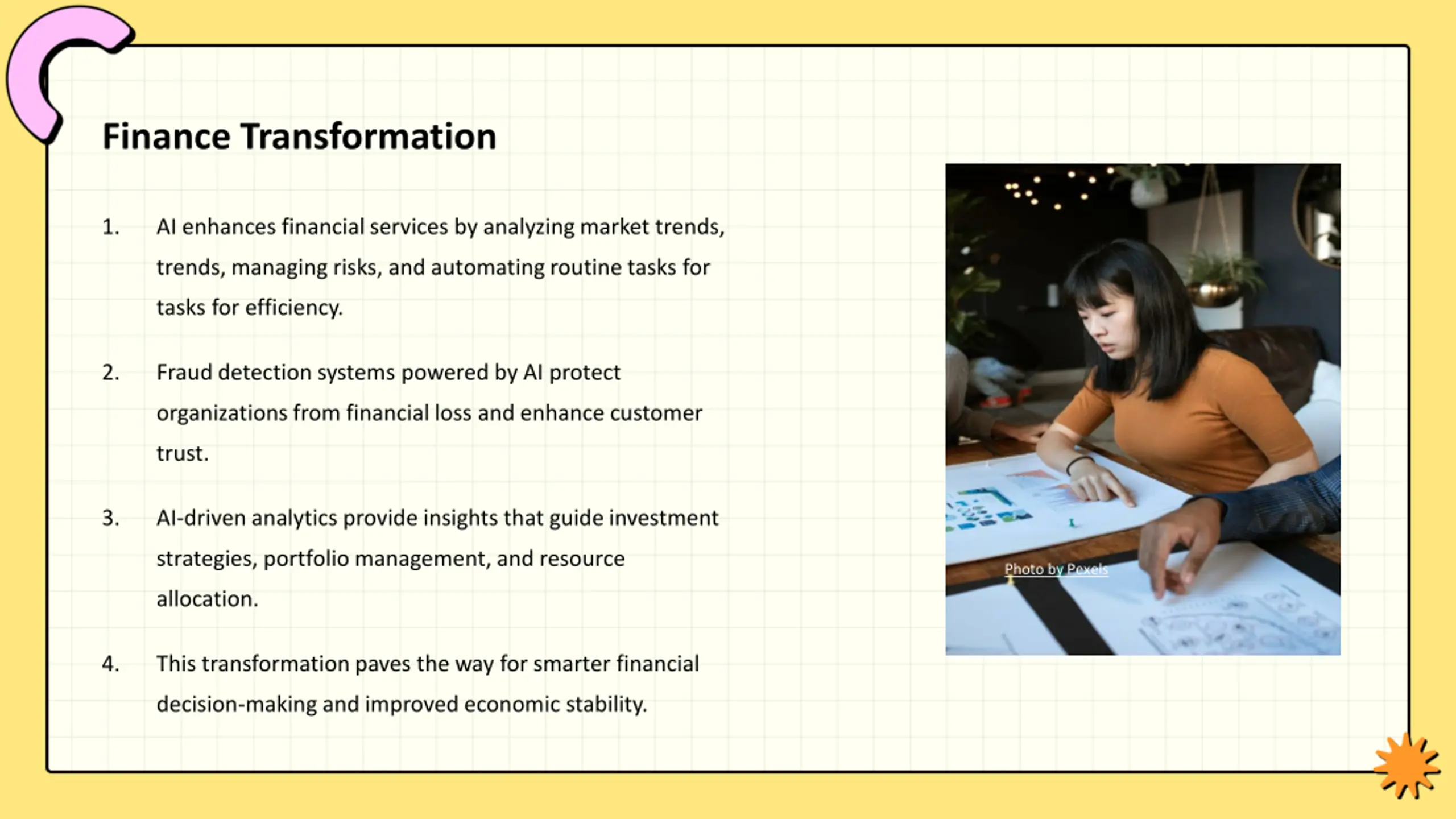 Finance Transformation 1. AI enhances financial services by analyzing market trends, trends, managing risks, and automating routine tasks for tasks for efficiency. 2. Fraud detection systems powered by AI protect organizations from financial loss and enhance customer trust. 3. AI-driven analytics provide insights that guide investment strategies, portfolio management, and resource Photo by Pexels allocation. 4. This transformation paves the way for smarter financial decision-making and improved economic stability.