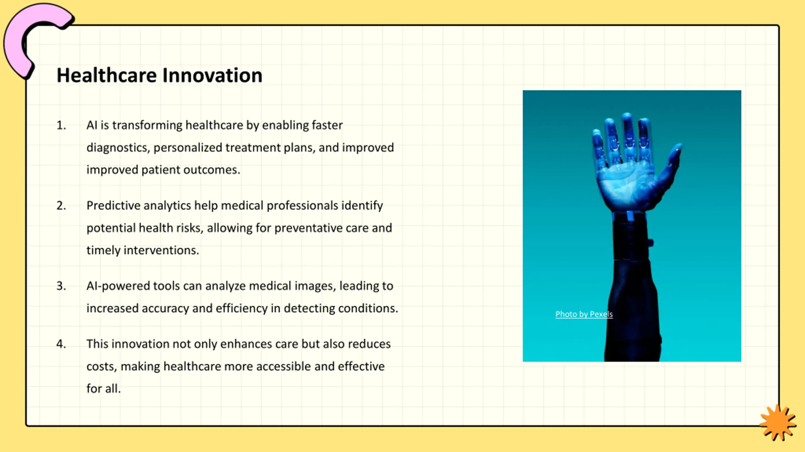 Healthcare Innovation 1. AI is transforming healthcare by enabling faster diagnostics, personalized treatment plans, and improved improved patient outcomes. 2. Predictive analytics help medical professionals identify potential health risks, allowing for preventative care and timely interventions. 3. AI-powered tools can analyze medical images, leading to increased accuracy and efficiency in detecting conditions. Photo by Pexels 4. This innovation not only enhances care but also reduces costs, making healthcare more accessible and effective for all.