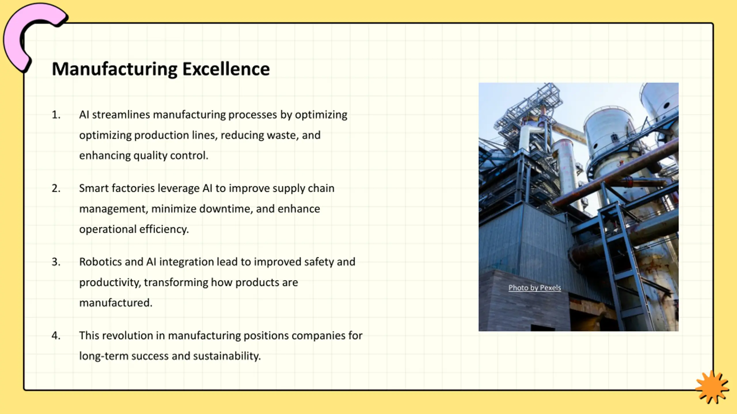 Manufacturing Excellence 1. AI streamlines manufacturing processes by optimizing optimizing production lines, reducing waste, and enhancing quality control. 2. Smart factories leverage AI to improve supply chain management, minimize downtime, and enhance operational efficiency. 3. Robotics and AI integration lead to improved safety and productivity, transforming how products are Photo by Pexels manufactured. 4. This revolution in manufacturing positions companies for long-term success and sustainability.