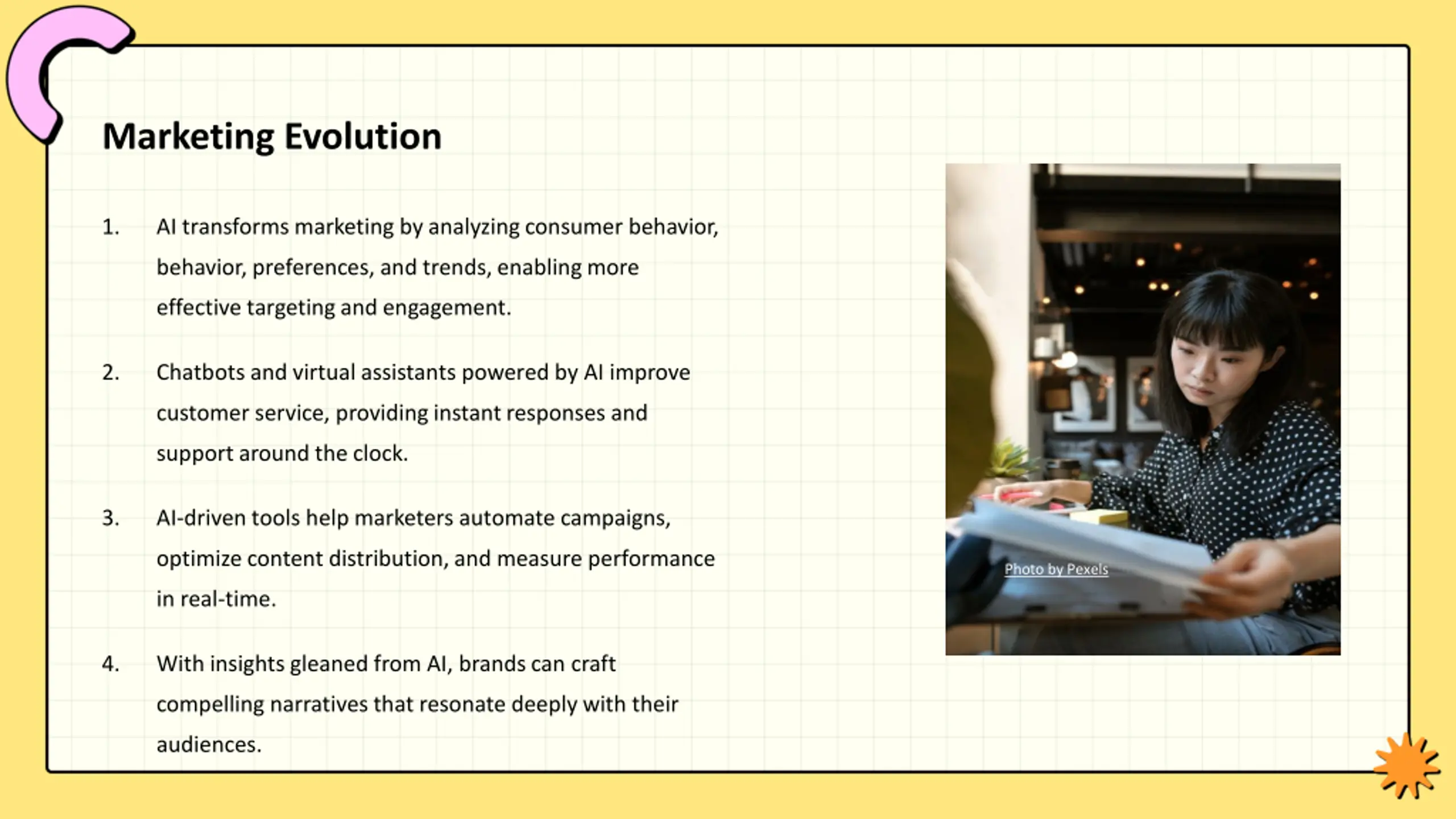 Marketing Evolution 1. AI transforms marketing by analyzing consumer behavior, behavior, preferences, and trends, enabling more effective targeting and engagement. 2. Chatbots and virtual assistants powered by AI improve customer service, providing instant responses and support around the clock. 3. AI-driven tools help marketers automate campaigns, optimize content distribution, and measure performance Photo by Pexels in real-time. 4. With insights gleaned from AI, brands can craft compelling narratives that resonate deeply with their audiences.