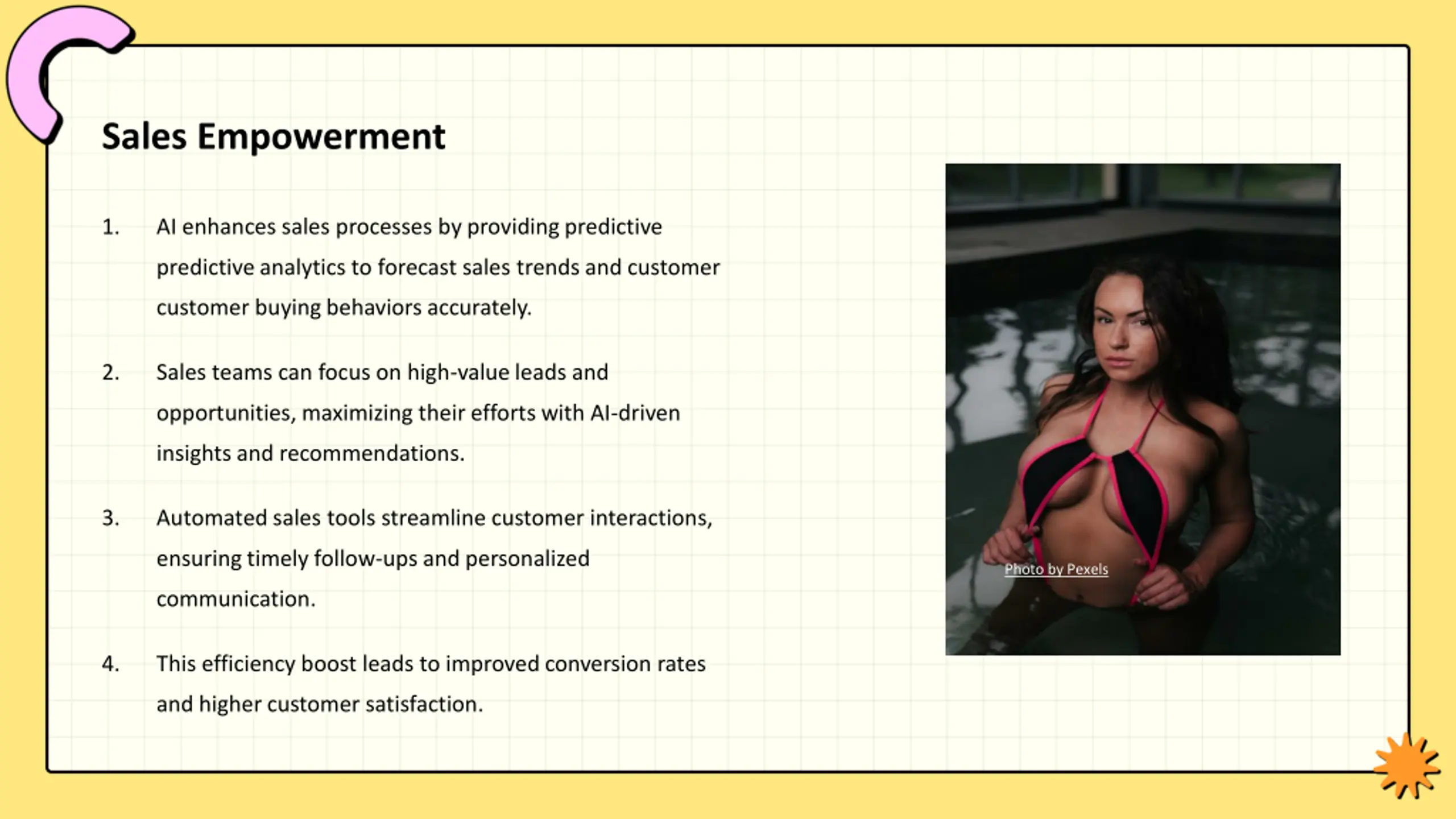 Sales Empowerment 1. AI enhances sales processes by providing predictive predictive analytics to forecast sales trends and customer customer buying behaviors accurately. 2. Sales teams can focus on high-value leads and opportunities, maximizing their efforts with AI-driven insights and recommendations. 3. Automated sales tools streamline customer interactions, ensuring timely follow-ups and personalized Photo by Pexels communication. 4. This efficiency boost leads to improved conversion rates and higher customer satisfaction.