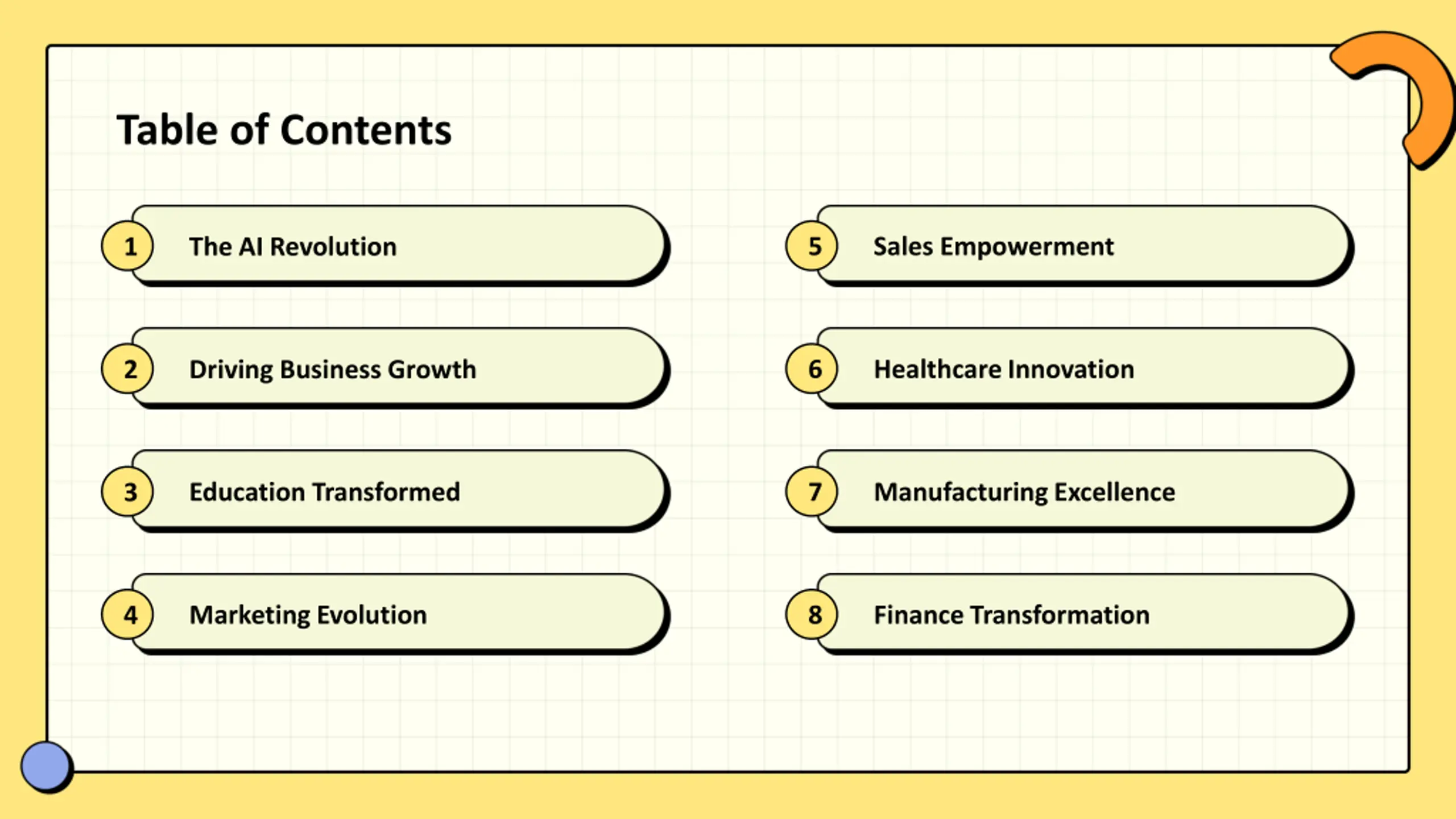 Table of Contents 5 Sales Empowerment 1 The AI Revolution 6 Healthcare Innovation 2 Driving Business Growth Education Transformed 7 Manufacturing Excellence 3 Marketing Evolution 8 Finance Transformation 4