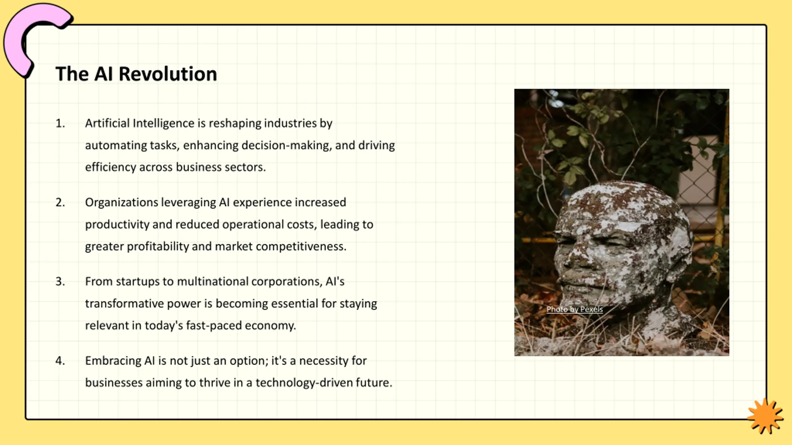The AI Revolution 1. Artificial Intelligence is reshaping industries by automating tasks, enhancing decision-making, and driving efficiency across business sectors. 2. Organizations leveraging AI experience increased productivity and reduced operational costs, leading to greater profitability and market competitiveness. 3. From startups to multinational corporations, AI's transformative power is becoming essential for staying Photo by Pexels relevant in today's fast-paced economy. 4. Embracing AI is not just an option; it's a necessity for businesses aiming to thrive in a technology-driven future.