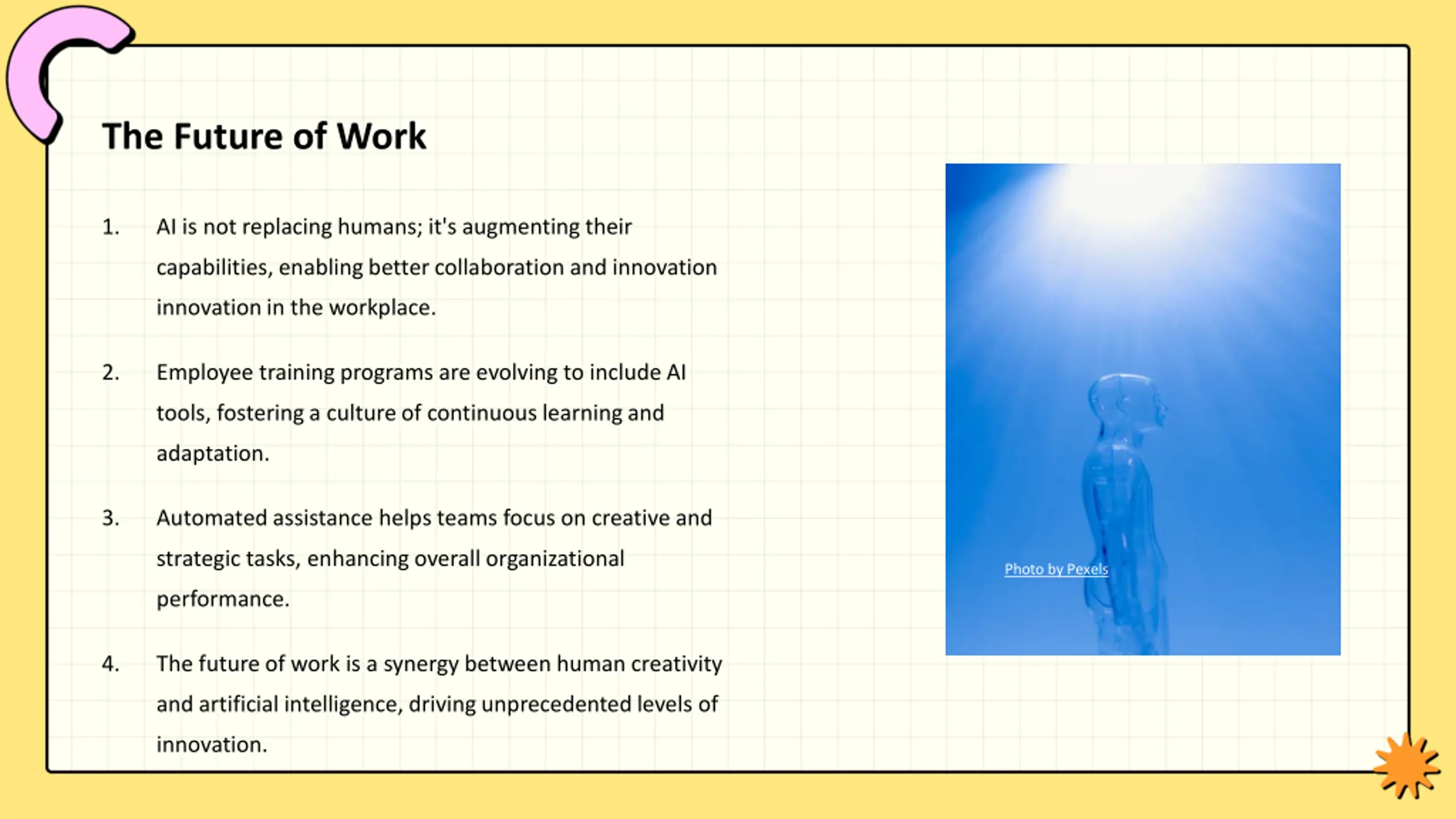 The Future of Work 1. AI is not replacing humans; it's augmenting their capabilities, enabling better collaboration and innovation innovation in the workplace. 2. Employee training programs are evolving to include AI tools, fostering a culture of continuous learning and adaptation. 3. Automated assistance helps teams focus on creative and strategic tasks, enhancing overall organizational Photo by Pexels performance. 4. The future of work is a synergy between human creativity and artificial intelligence, driving unprecedented levels of innovation.