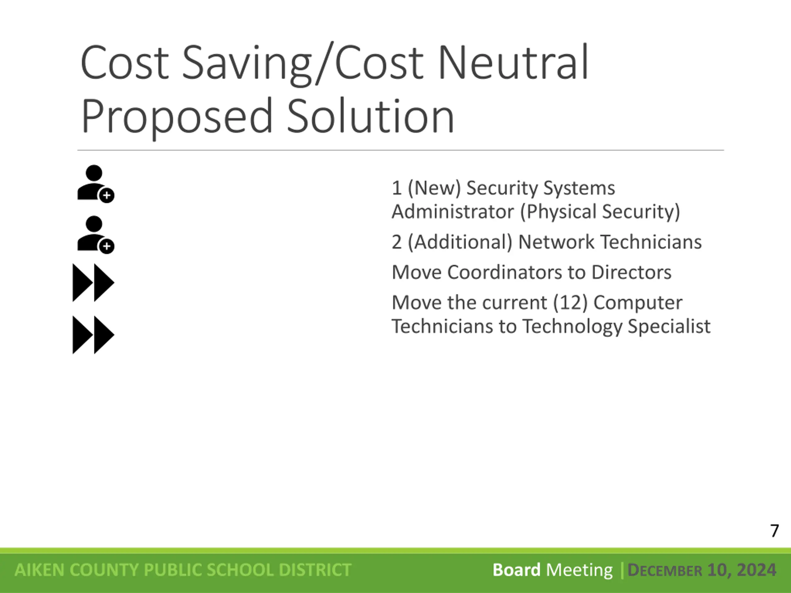 Proposed Solution 1 (New) Security Systems Administrator (Physical Security) 2 (Additional) Network Technicians Move Coordinators to Directors Move the current (12) Computer Technicians to Technology Specialist ($25,000 in starting pay) Computer Technicians currently do the same job as the Technology Specialist Currently each CT/TS support 2 or more sites/schools 6 AIKEN COUNTY PUBLIC SCHOOL DISTRICT Board Meeting |DECEMBER 10, 2024