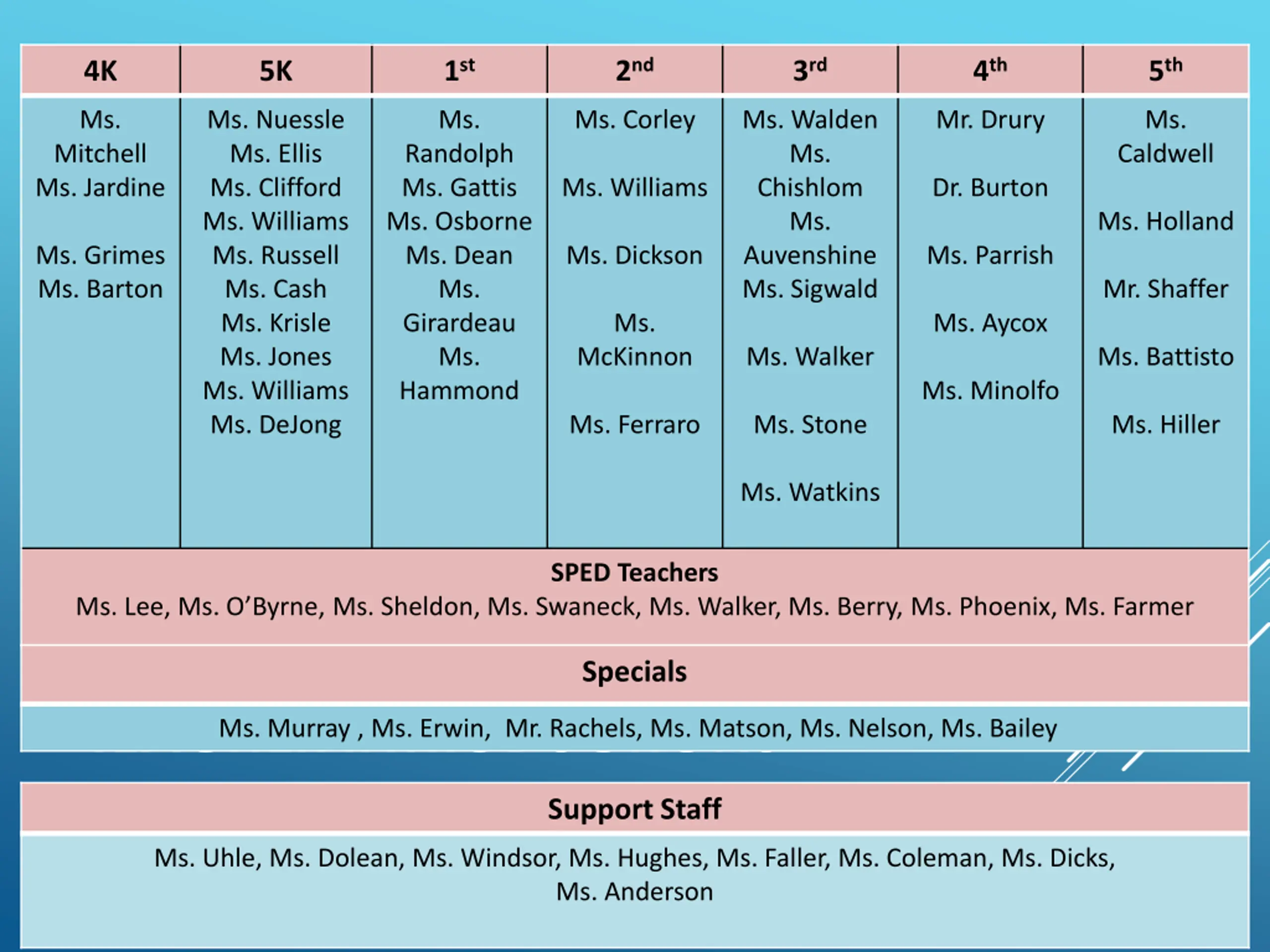 1st 2nd 3rd 4th 5th 4K 5K Ms. Ms. Nuessle Ms. Ellis Ms. Clifford Ms. Williams Ms. Russell Ms. Cash Ms. Krisle Ms. Jones Ms. Williams Ms. DeJong Ms. Ms. Corley Ms. Walden Ms. Chishlom Ms. Auvenshine Ms. Sigwald Mr. Drury Ms. Mitchell Ms. Jardine Randolph Ms. Gattis Ms. Osborne Ms. Dean Ms. Girardeau Ms. Hammond Caldwell Ms. Williams Dr. Burton Ms. Holland Ms. Grimes Ms. Barton Ms. Dickson Ms. Parrish Mr. Shaffer Ms. Ms. Aycox McKinnon Ms. Walker Ms. Battisto Ms. Minolfo Ms. Ferraro Ms. Stone Ms. Hiller Ms. Watkins SPED Teachers Ms. Lee, Ms. O Byrne, Ms. Sheldon, Ms. Swaneck, Ms. Walker, Ms. Berry, Ms. Phoenix, Ms. Farmer Specials TEACHER INTRODUCTIONS Ms. Murray , Ms. Erwin, Mr. Rachels, Ms. Matson, Ms. Nelson, Ms. Bailey Support Staff Ms. Uhle, Ms. Dolean, Ms. Windsor, Ms. Hughes, Ms. Faller, Ms. Coleman, Ms. Dicks, Ms. Anderson