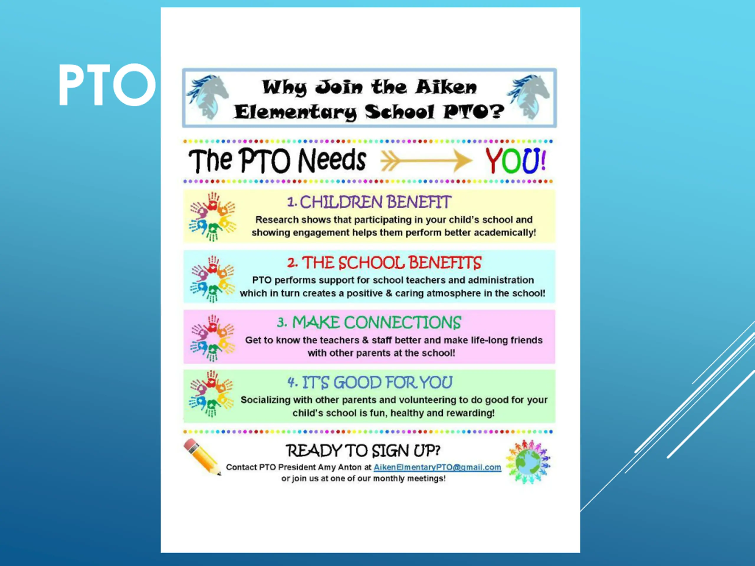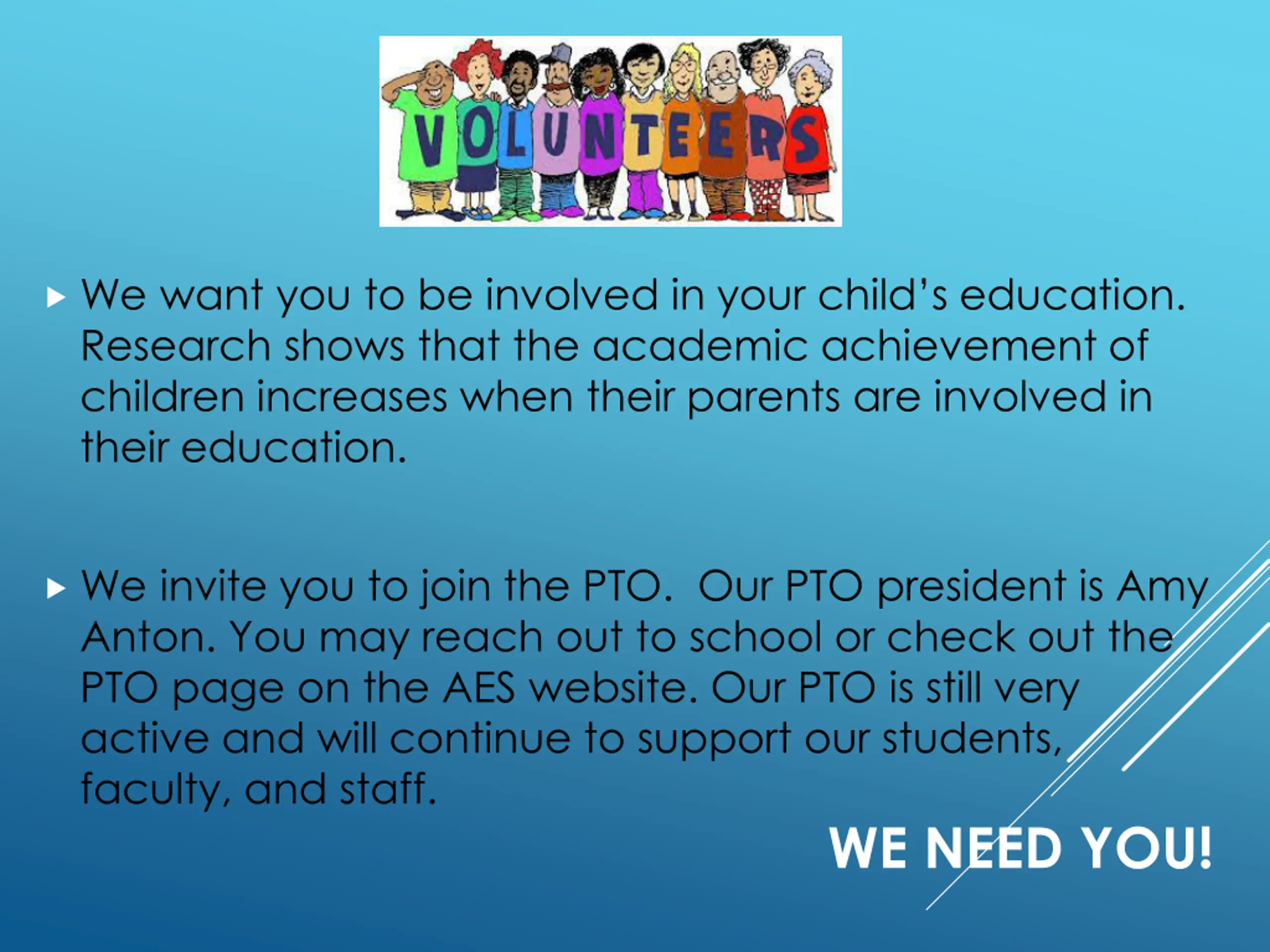 We want you to be involved in your childs education. Research shows that the academic achievement of children increases when their parents are involved in their education. We invite you to join the PTO. Our PTO president is Amy Anton. You may reach out to school or check out the PTO page on the AES website. Our PTO is still very active and will continue to support our students, faculty, and staff. WE NEED YOU!