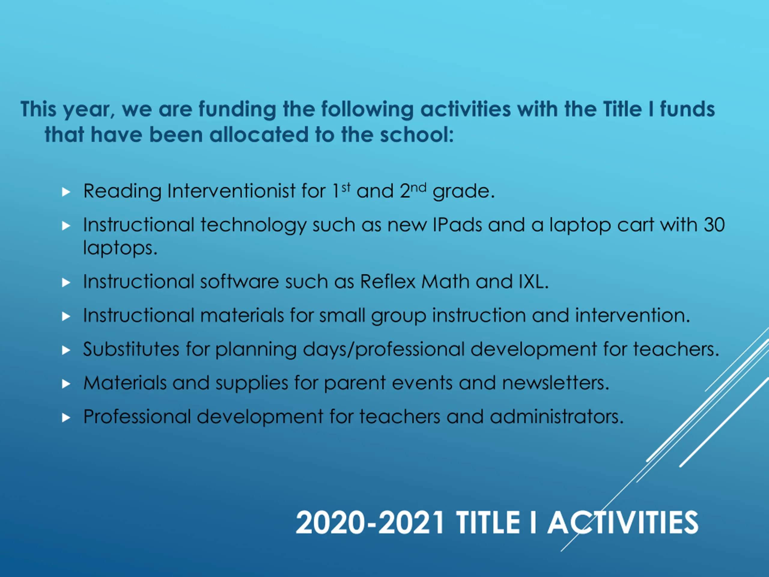 This year, we are funding the following activities with the Title I funds that have been allocated to the school: Reading Interventionist for 1stand 2ndgrade. Instructional technology such as new IPads and a laptop cart with 30 laptops. Instructional software such as Reflex Math and IXL. Instructional materials for small group instruction and intervention. Substitutes for planning days/professional development for teachers. Materials and supplies for parent events and newsletters. Professional development for teachers and administrators. 2020-2021 TITLE I ACTIVITIES