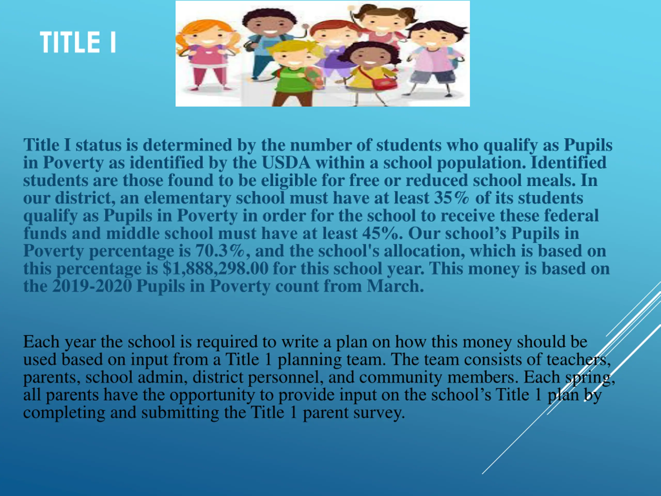 TITLE I Title I status is determined by the number of students who qualify as Pupils in Poverty as identified by the USDA within a school population. Identified students are those found to be eligible for free or reduced school meals. In our district, an elementary school must have at least 35% of its students qualify as Pupils in Poverty in order for the school to receive these federal funds and middle school must have at least 45%. Our school s Pupils in Poverty percentage is 70.3%, and the school's allocation, which is based on this percentage is $1,888,298.00 for this school year. This money is based on the 2019-2020 Pupils in Poverty count from March. Each year the school is required to write a plan on how this money should be used based on input from a Title 1 planning team. The team consists of teachers, parents, school admin, district personnel, and community members. Each spring, all parents have the opportunity to provide input on the school s Title 1 plan by completing and submitting the Title 1 parent survey.