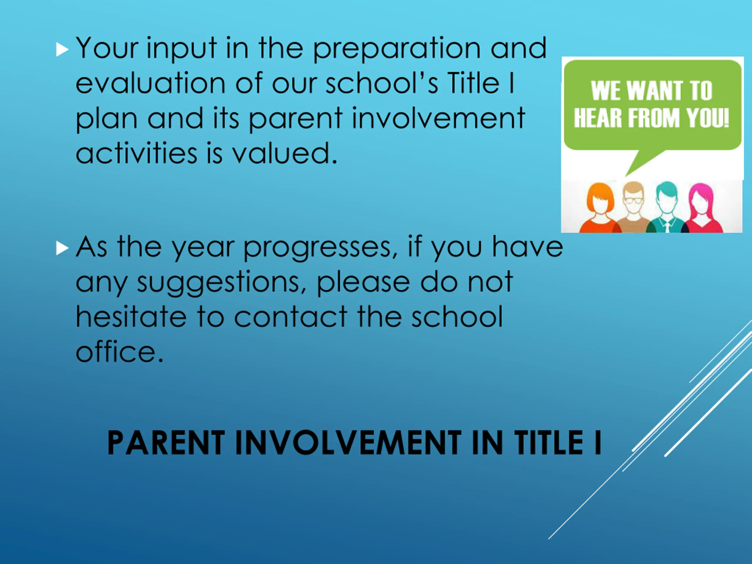 Your input in the preparation and evaluation of our school s Title I plan and its parent involvement activities is valued. As the year progresses, if you have any suggestions, please do not hesitate to contact the school office. PARENT INVOLVEMENT IN TITLE I