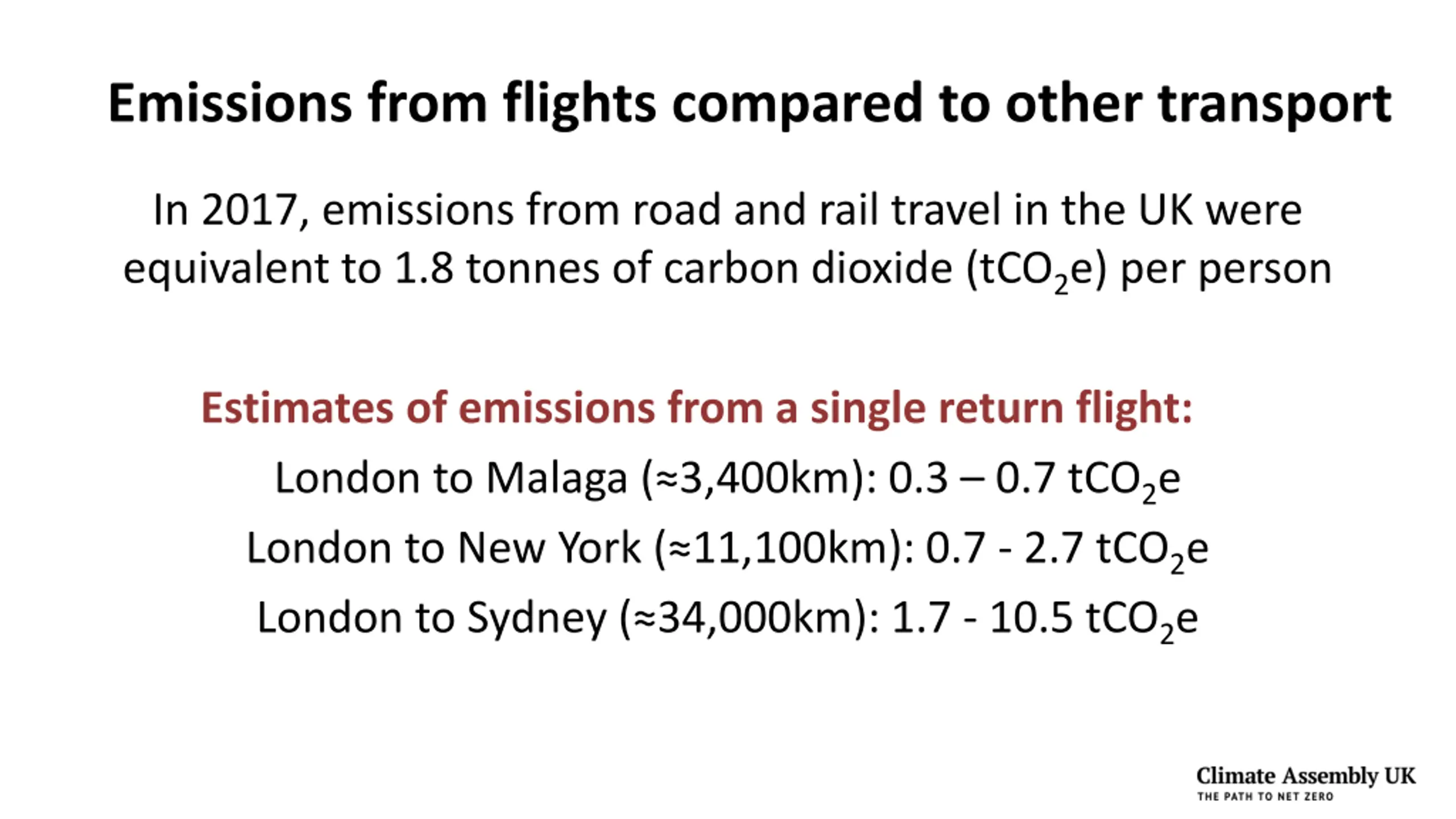 Emissions from flights compared to other transport In 2017, emissions from road and rail travel in the UK were equivalent to 1.8 tonnes of carbon dioxide (tCO2e) per person Estimates of emissions from a single return flight: London to Malaga ( 3,400km): 0.3 0.7 tCO2e London to New York ( 11,100km): 0.7 - 2.7 tCO2e London to Sydney ( 34,000km): 1.7 - 10.5 tCO2e