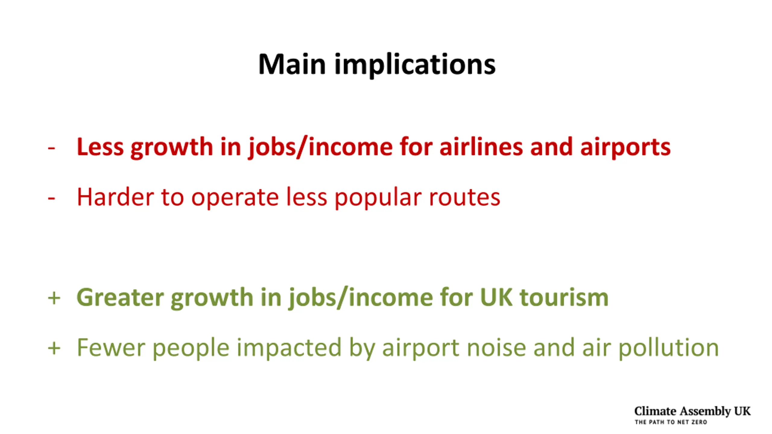 Main implications - Less growth in jobs/income for airlines and airports - Harder to operate less popular routes + Greater growth in jobs/income for UK tourism + Fewer people impacted by airport noise and air pollution