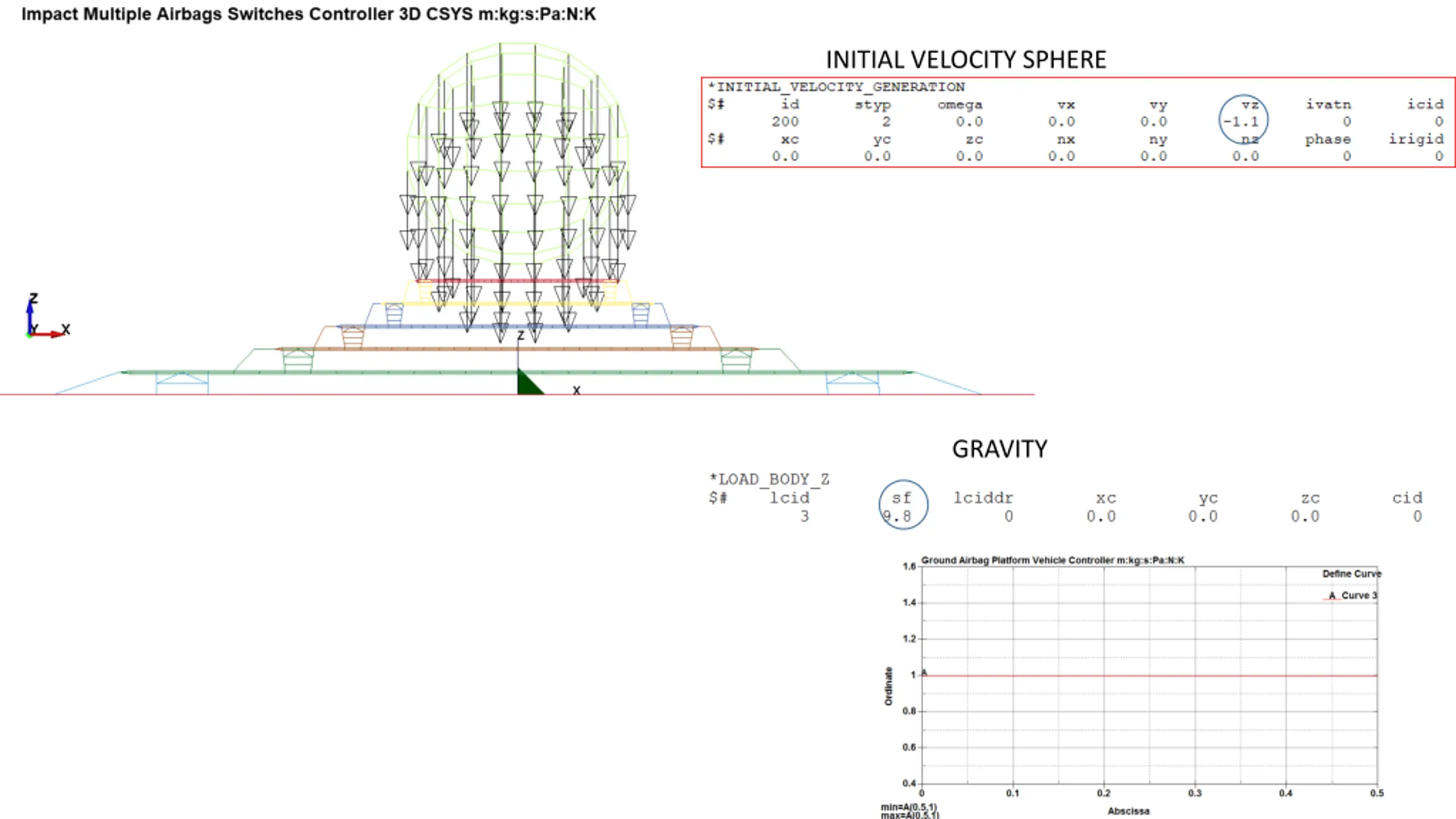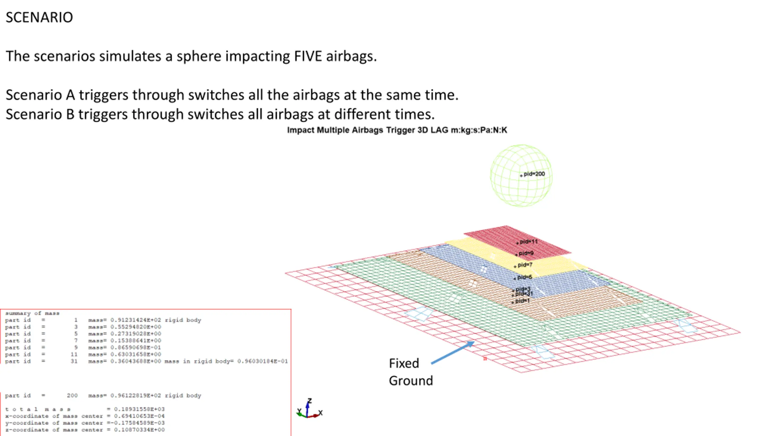 SCENARIO The scenarios simulates a sphere impacting FIVE airbags. Scenario A triggers through switches all the airbags at the same time. Scenario B triggers through switches all airbags at different times. Fixed Ground
