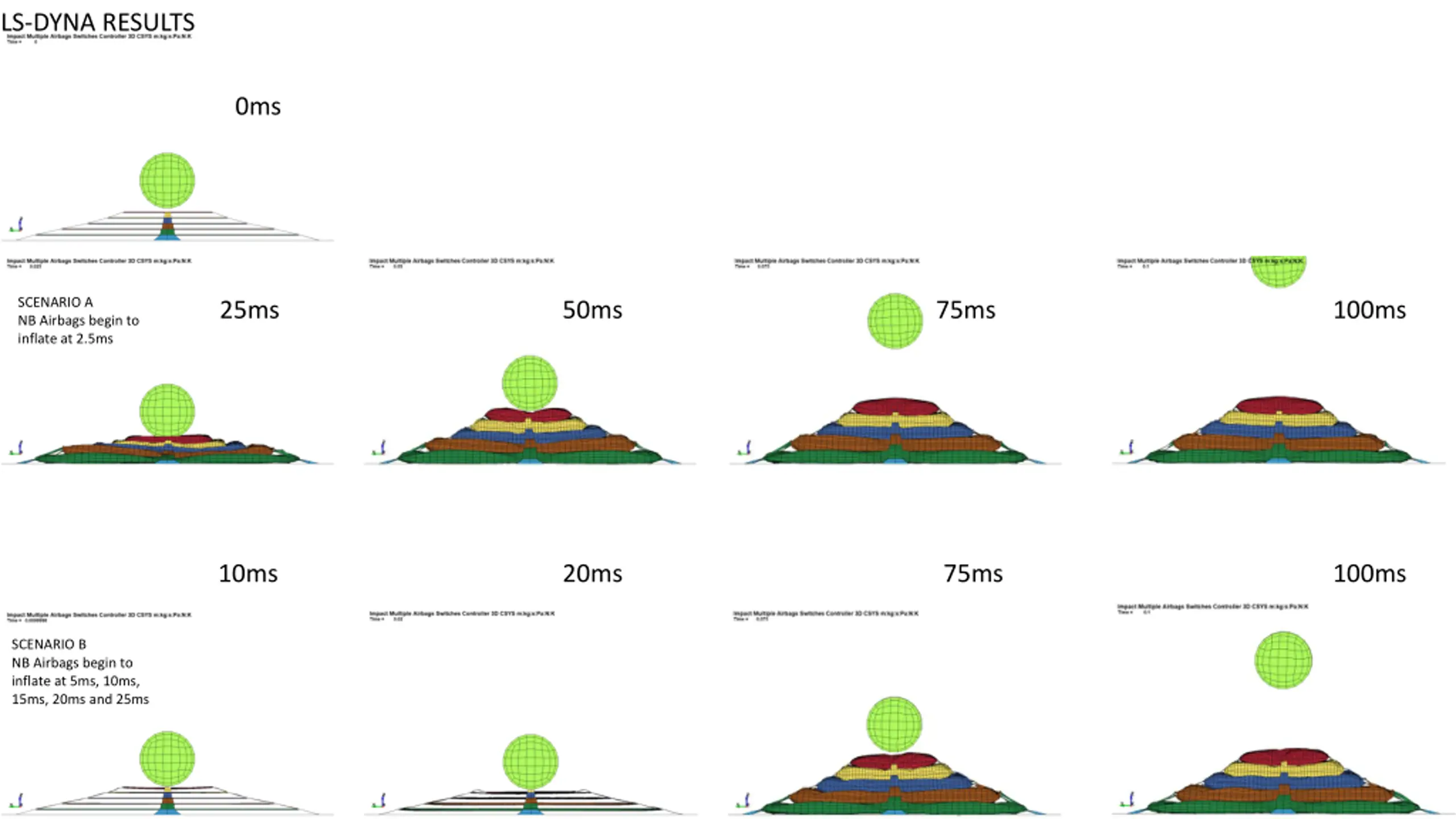 LS-DYNA RESULTS 0ms SCENARIO A NB Airbags begin to inflate at 2.5ms 25ms 50ms 75ms 100ms 10ms 20ms 75ms 100ms SCENARIO B NB Airbags begin to inflate at 5ms, 10ms, 15ms, 20ms and 25ms