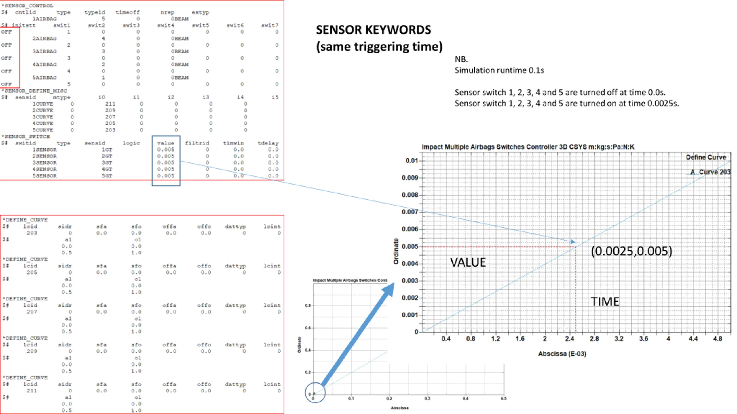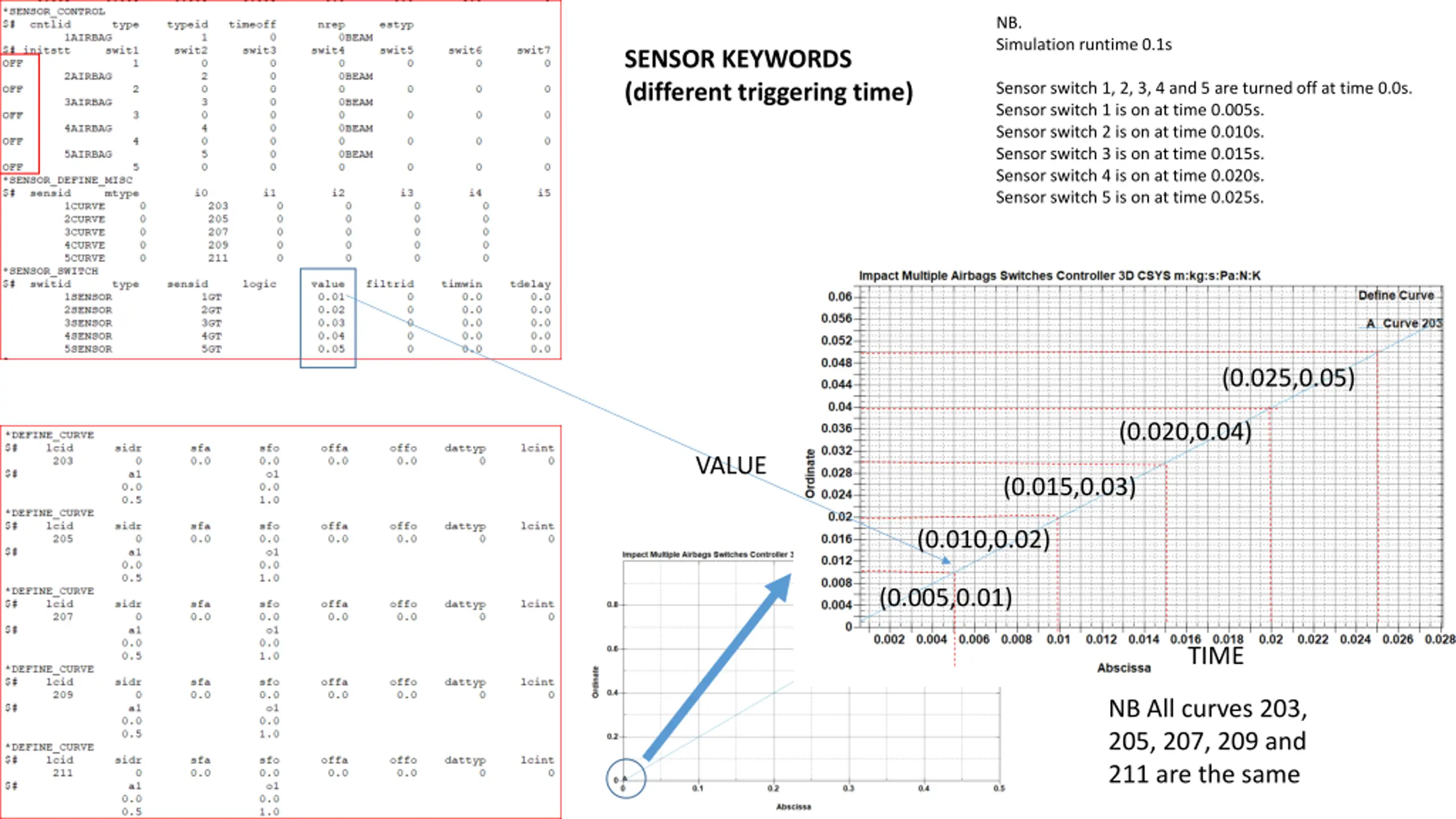 NB. Simulation runtime 0.1s SENSOR KEYWORDS (different triggering time) Sensor switch 1, 2, 3, 4 and 5 are turned off at time 0.0s. Sensor switch 1 is on at time 0.005s. Sensor switch 2 is on at time 0.010s. Sensor switch 3 is on at time 0.015s. Sensor switch 4 is on at time 0.020s. Sensor switch 5 is on at time 0.025s. (0.025,0.05) (0.020,0.04) VALUE (0.015,0.03) (0.010,0.02) (0.005,0.01) TIME NB All curves 203, 205, 207, 209 and 211 are the same