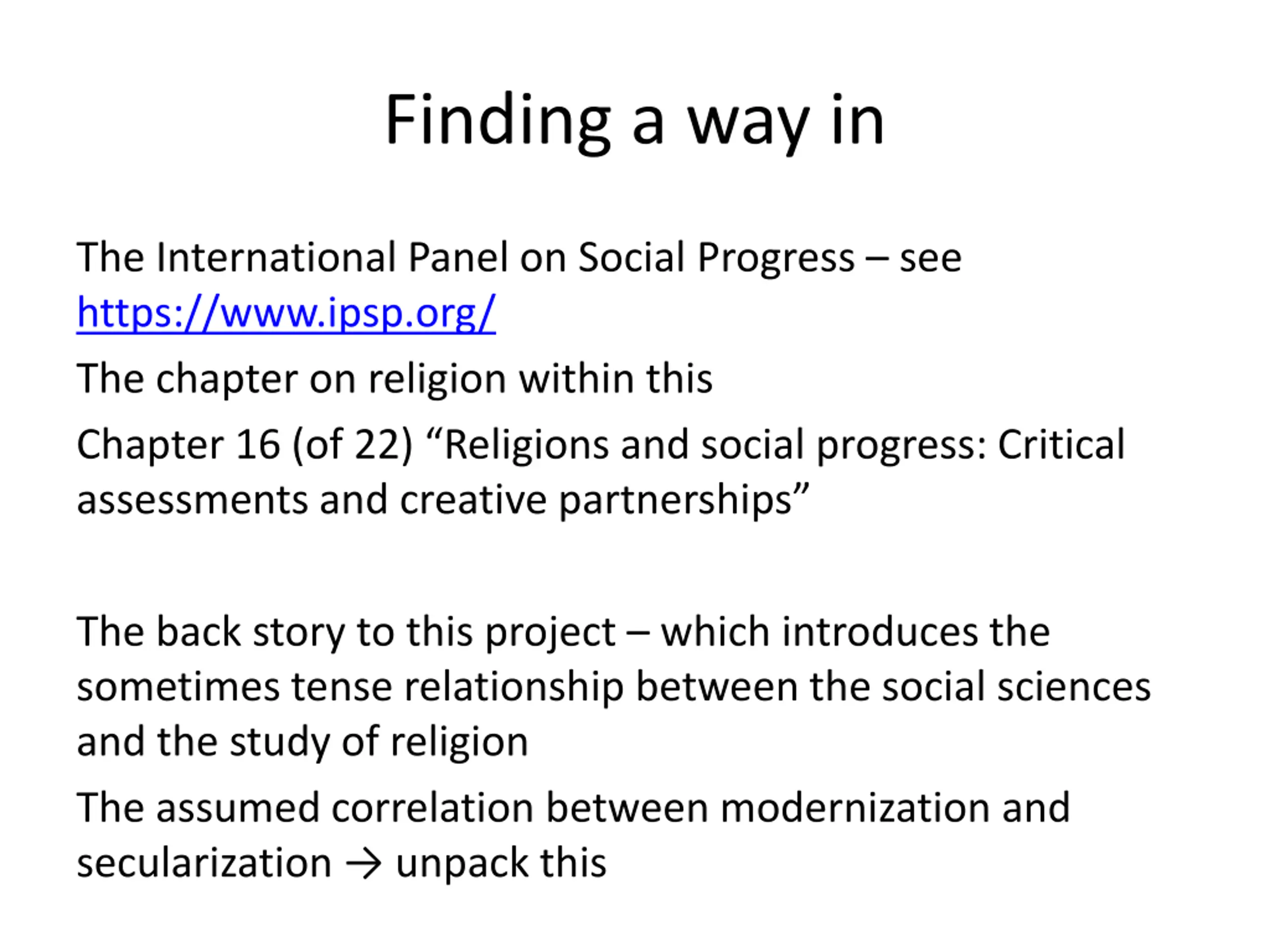 Finding a way in The International Panel on Social Progress see https://www.ipsp.org/ The chapter on religion within this Chapter 16 (of 22) Religions and social progress: Critical assessments and creative partnerships The back story to this project which introduces the sometimes tense relationship between the social sciences and the study of religion The assumed correlation between modernization and secularization unpack this
