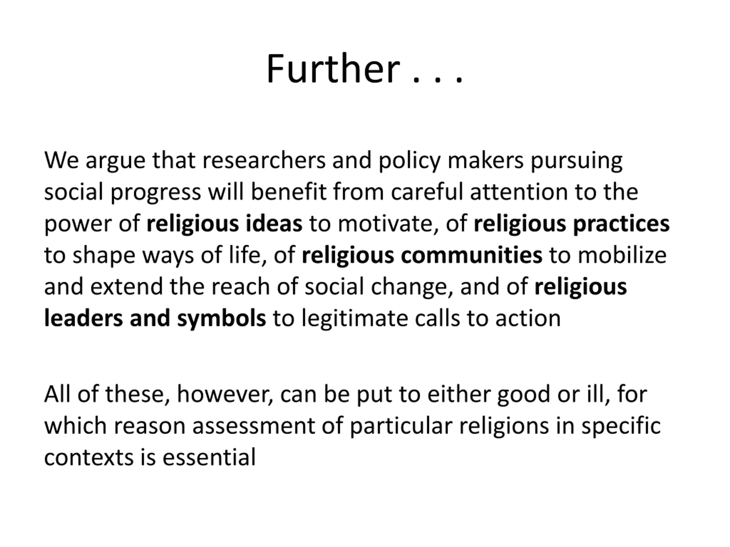 Further . . . We argue that researchers and policy makers pursuing social progress will benefit from careful attention to the power of religious ideas to motivate, of religious practices to shape ways of life, of religious communities to mobilize and extend the reach of social change, and of religious leaders and symbols to legitimate calls to action All of these, however, can be put to either good or ill, for which reason assessment of particular religions in specific contexts is essential