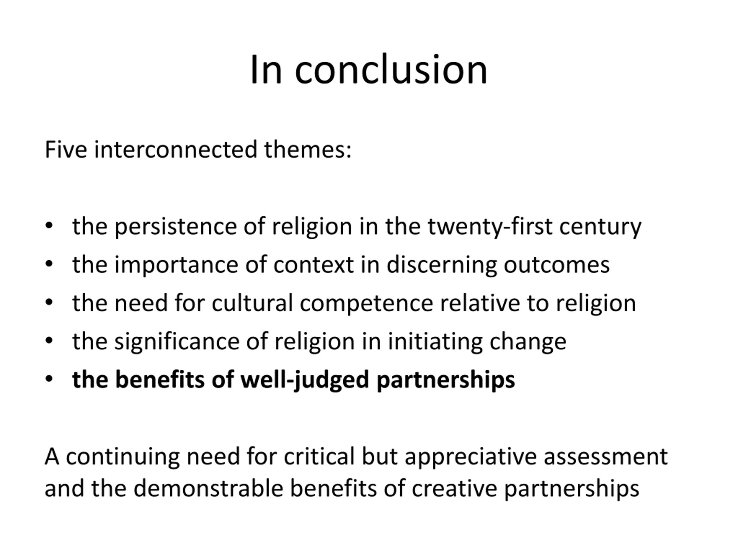 In conclusion Five interconnected themes: the persistence of religion in the twenty-first century the importance of context in discerning outcomes the need for cultural competence relative to religion the significance of religion in initiating change the benefits of well-judged partnerships A continuing need for critical but appreciative assessment and the demonstrable benefits of creative partnerships