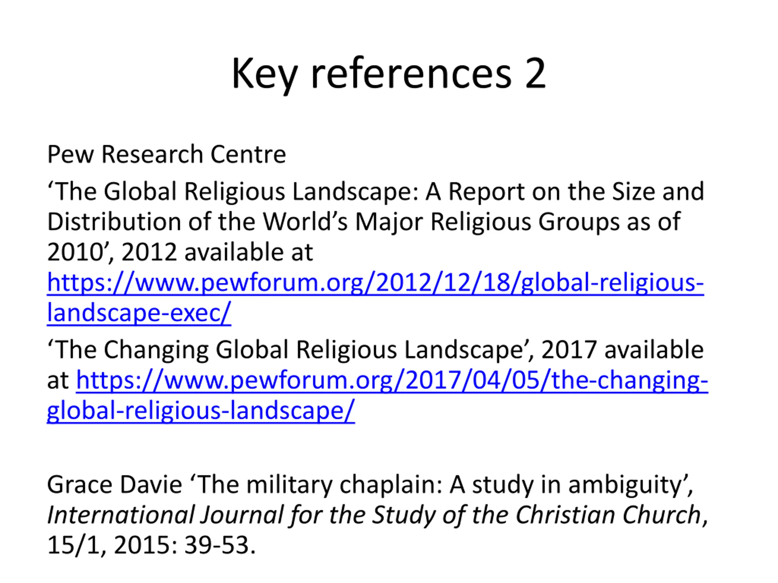 Key references 2 Pew Research Centre The Global Religious Landscape: A Report on the Size and Distribution of the World s Major Religious Groups as of 2010 , 2012 available at https://www.pewforum.org/2012/12/18/global-religious- landscape-exec/ The Changing Global Religious Landscape , 2017 available at https://www.pewforum.org/2017/04/05/the-changing- global-religious-landscape/ Grace Davie The military chaplain: A study in ambiguity , International Journal for the Study of the Christian Church, 15/1, 2015: 39-53.