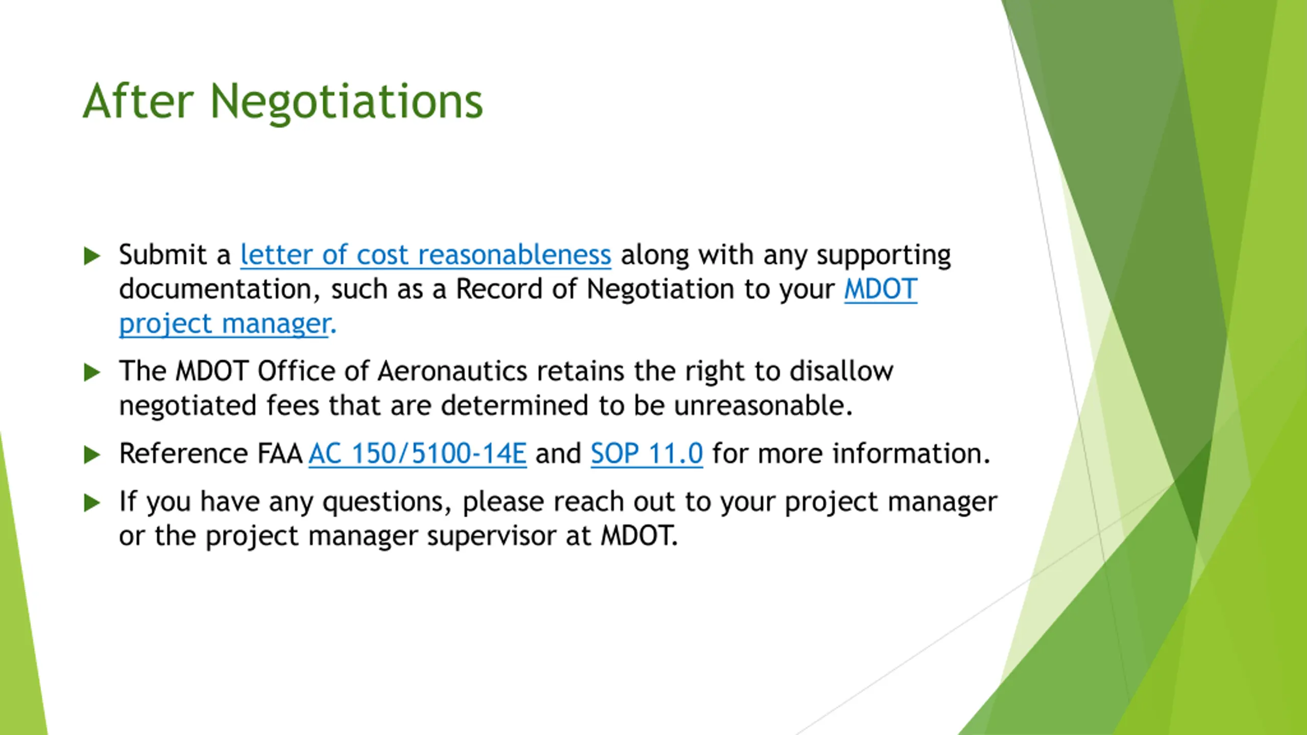 After Negotiations Submit a letter of cost reasonableness along with any supporting documentation, such as a Record of Negotiation to your MDOT project manager. The MDOT Office of Aeronautics retains the right to disallow negotiated fees that are determined to be unreasonable. Reference FAAAC 150/5100-14E and SOP 11.0 for more information. If you have any questions, please reach out to your project manager or the project manager supervisor at MDOT.
