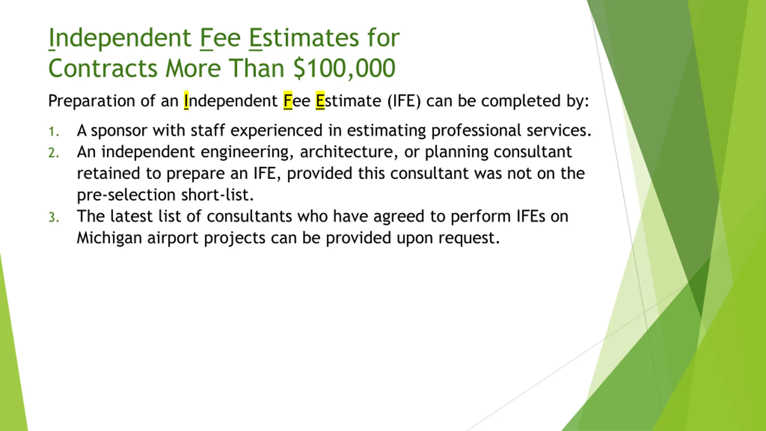 Independent Fee Estimates for Contracts More Than $100,000 Preparation of an Independent Fee Estimate (IFE) can be completed by: A sponsor with staff experienced in estimating professional services. An independent engineering, architecture, or planning consultant retained to prepare an IFE, provided this consultant was not on the pre-selection short-list. The latest list of consultants who have agreed to perform IFEs on Michigan airport projects can be provided upon request. 1. 2. 3.