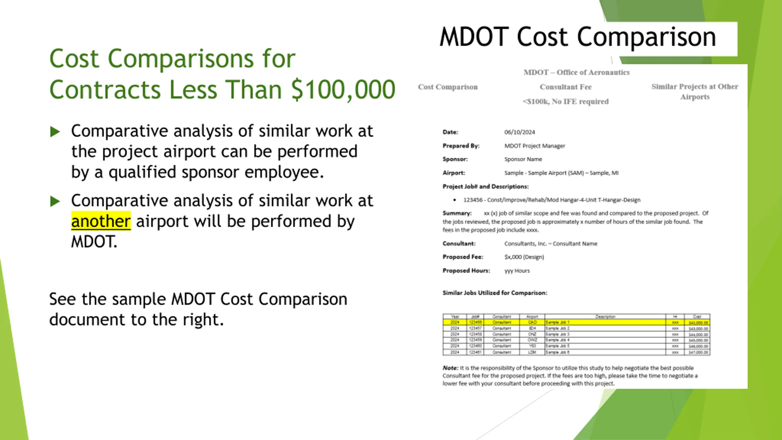 MDOT Cost Comparison Cost Comparisons for Contracts Less Than $100,000 Comparative analysis of similar work at the project airport can be performed by a qualified sponsor employee. Comparative analysis of similar work at another airport will be performed by MDOT. See the sample MDOT Cost Comparison document to the right.