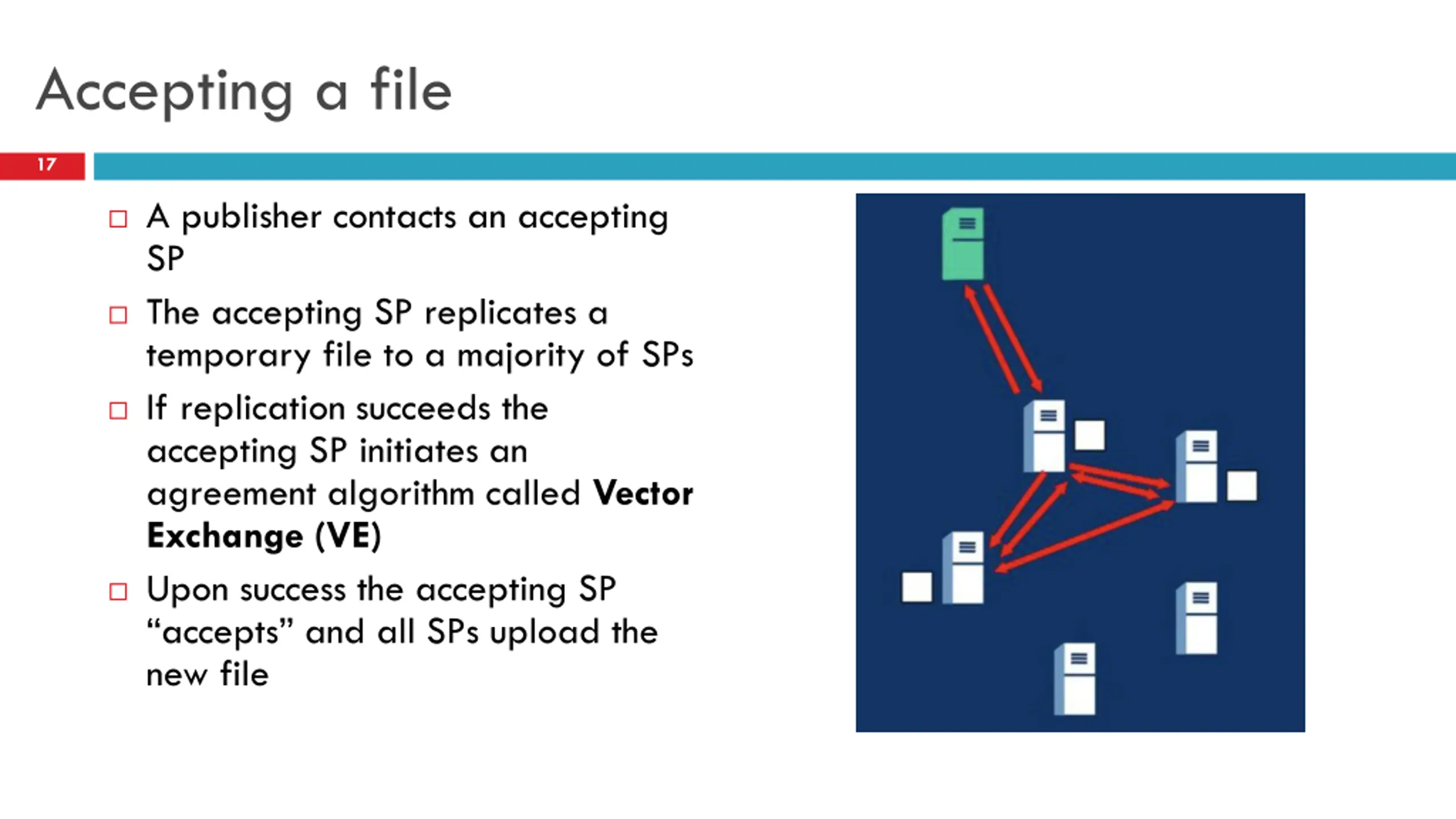 Accepting a file 17 A publisher contacts an accepting SP The accepting SP replicates a temporary file to a majority of SPs If replication succeeds the accepting SP initiates an agreement algorithm called Vector Exchange (VE) Upon success the accepting SP accepts and all SPs upload the new file