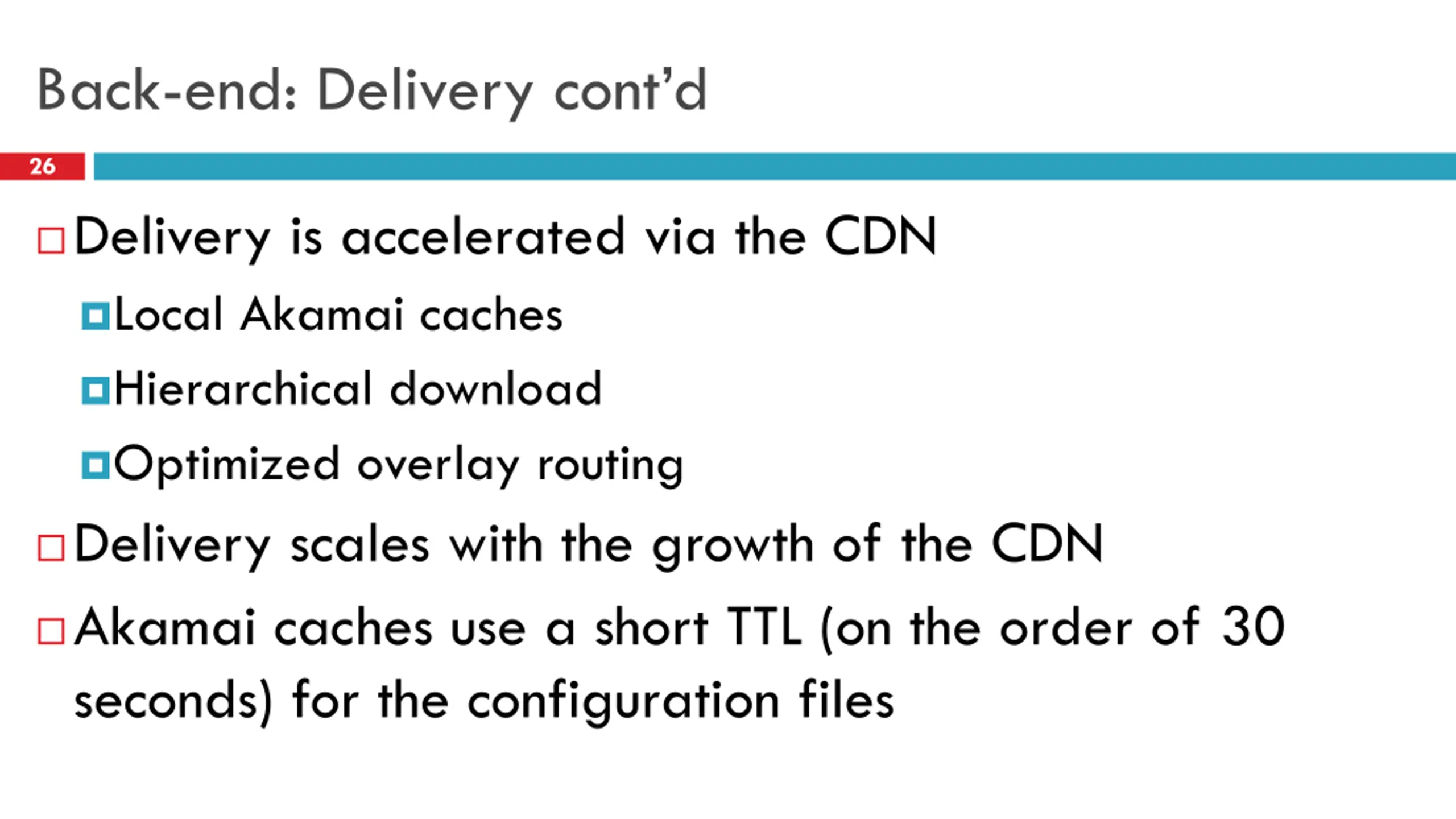 Back-end: Delivery contd 26 Delivery is accelerated via the CDN Local Akamai caches Hierarchical download Optimized overlay routing Delivery scales with the growth of the CDN Akamai caches use a short TTL (on the order of 30 seconds) for the configuration files