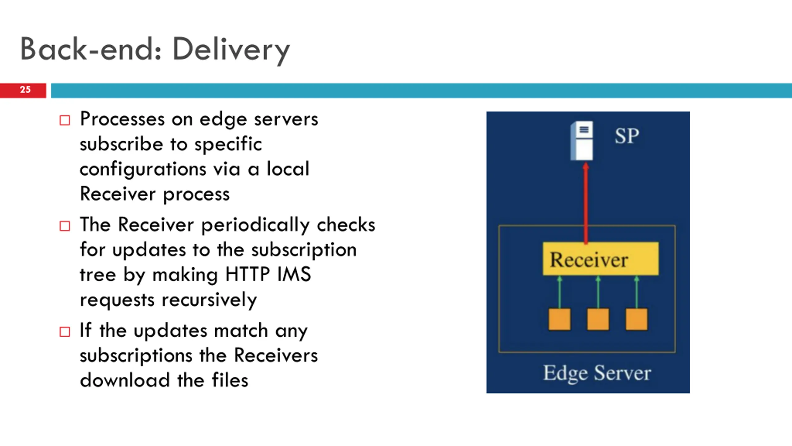 Back-end: Delivery 25 Processes on edge servers subscribe to specific configurations via a local Receiver process The Receiver periodically checks for updates to the subscription tree by making HTTP IMS requests recursively If the updates match any subscriptions the Receivers download the files