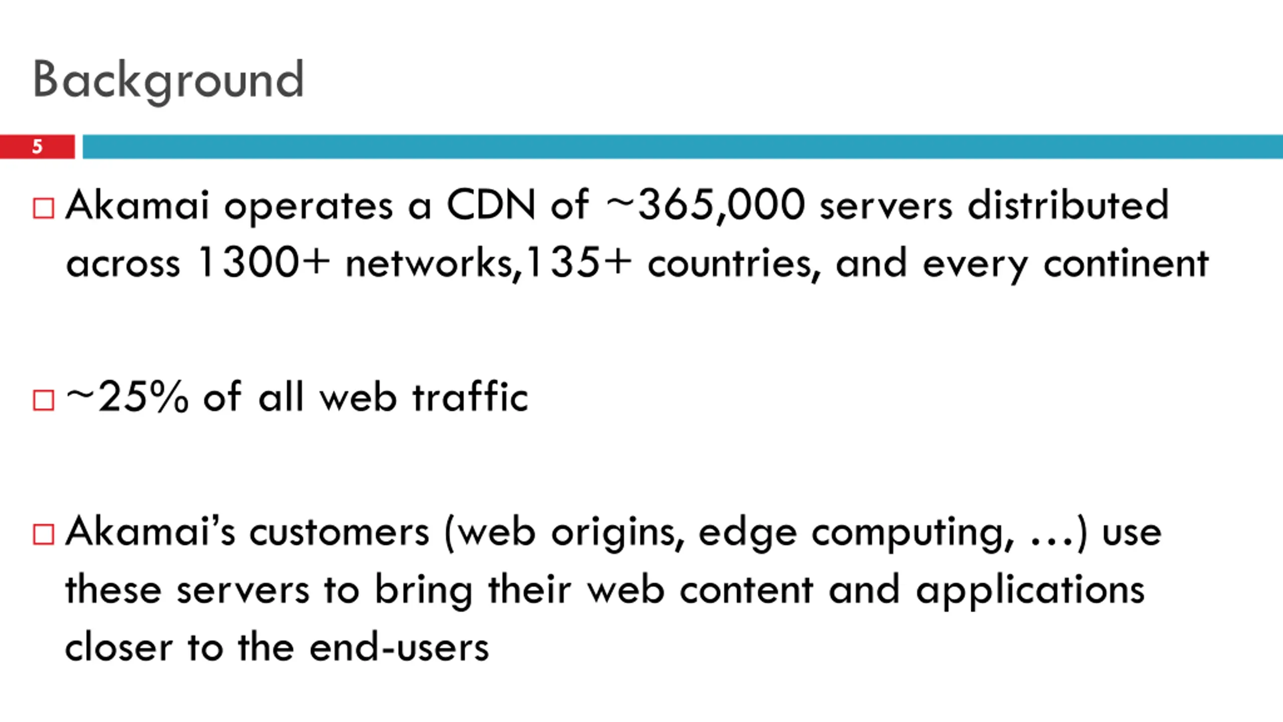 Background 5 Akamai operates a CDN of ~365,000 servers distributed across 1300+ networks,135+ countries, and every continent ~25% of all web traffic Akamai s customers (web origins, edge computing, ) use these servers to bring their web content and applications closer to the end-users