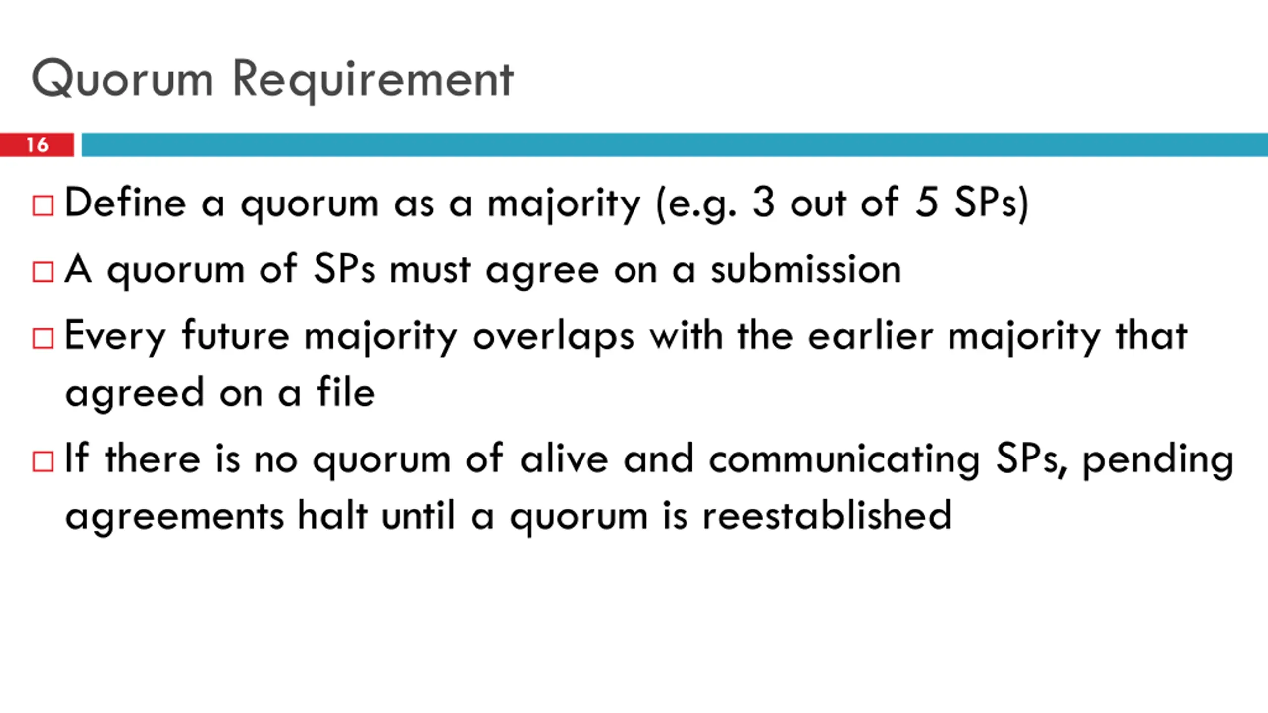 Quorum Requirement 16 Define a quorum as a majority (e.g. 3 out of 5 SPs) A quorum of SPs must agree on a submission Every future majority overlaps with the earlier majority that agreed on a file If there is no quorum of alive and communicating SPs, pending agreements halt until a quorum is reestablished