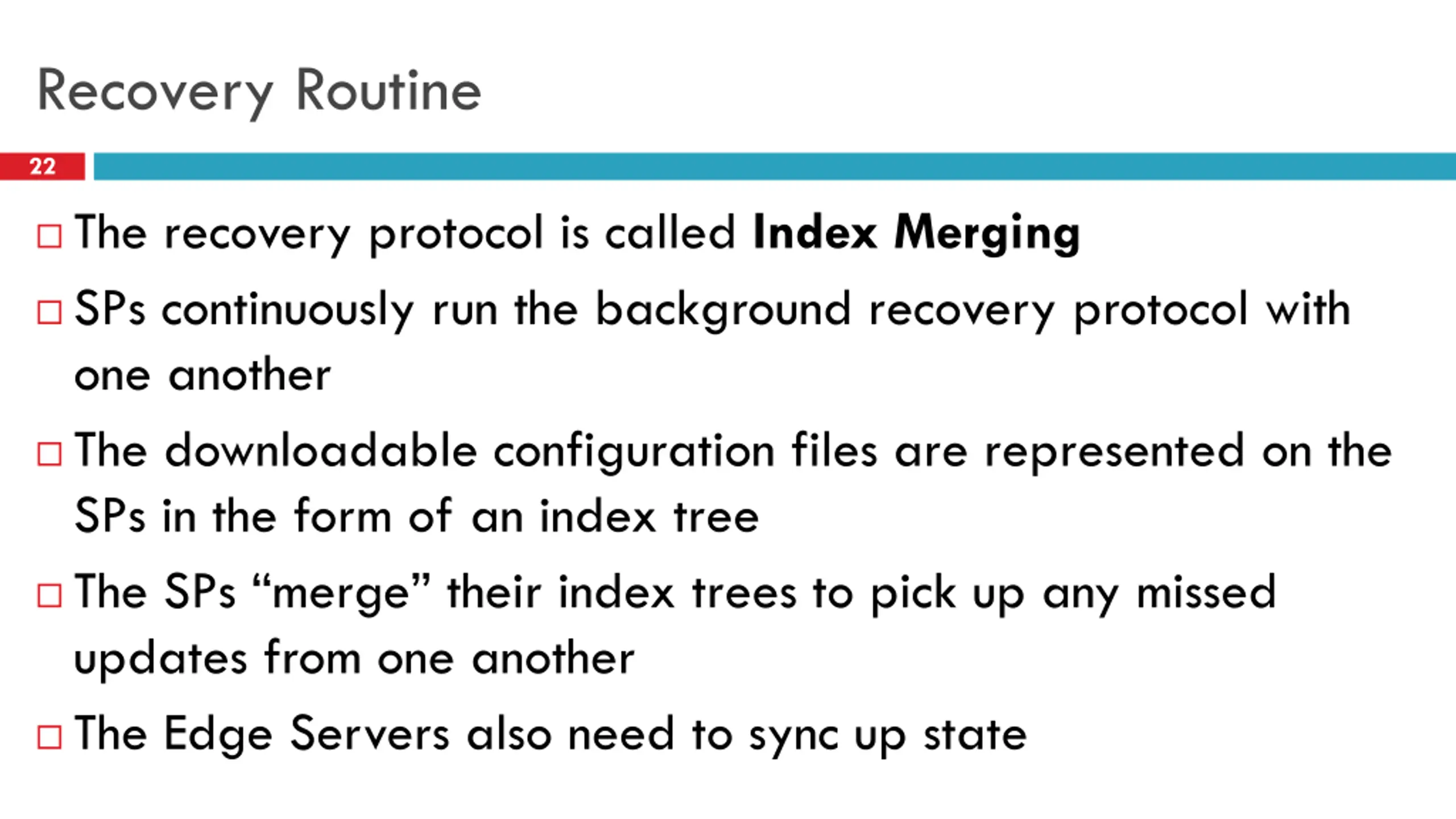 Recovery Routine 22 The recovery protocol is called Index Merging SPs continuously run the background recovery protocol with one another The downloadable configuration files are represented on the SPs in the form of an index tree The SPs merge their index trees to pick up any missed updates from one another The Edge Servers also need to sync up state