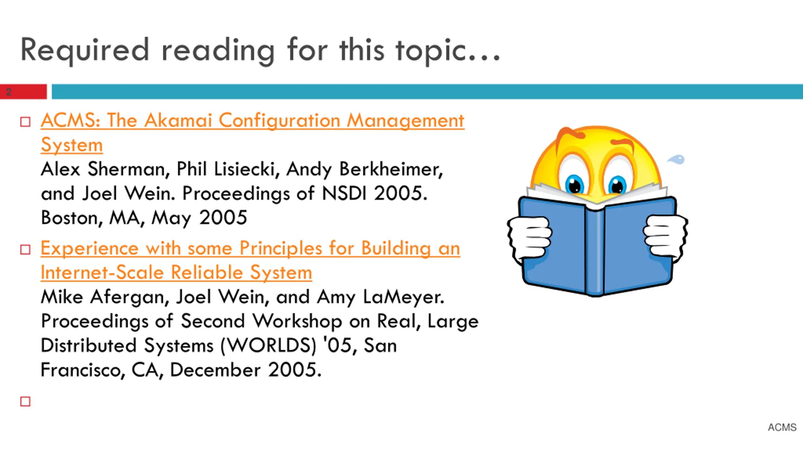 Required reading for this topic 2 ACMS: The Akamai Configuration Management System Alex Sherman, Phil Lisiecki, Andy Berkheimer, and Joel Wein. Proceedings of NSDI 2005. Boston, MA, May 2005 Experience with some Principles for Building an Internet-Scale Reliable System Mike Afergan, Joel Wein, and Amy LaMeyer. Proceedings of Second Workshop on Real, Large Distributed Systems (WORLDS) '05, San Francisco, CA, December 2005. ACMS