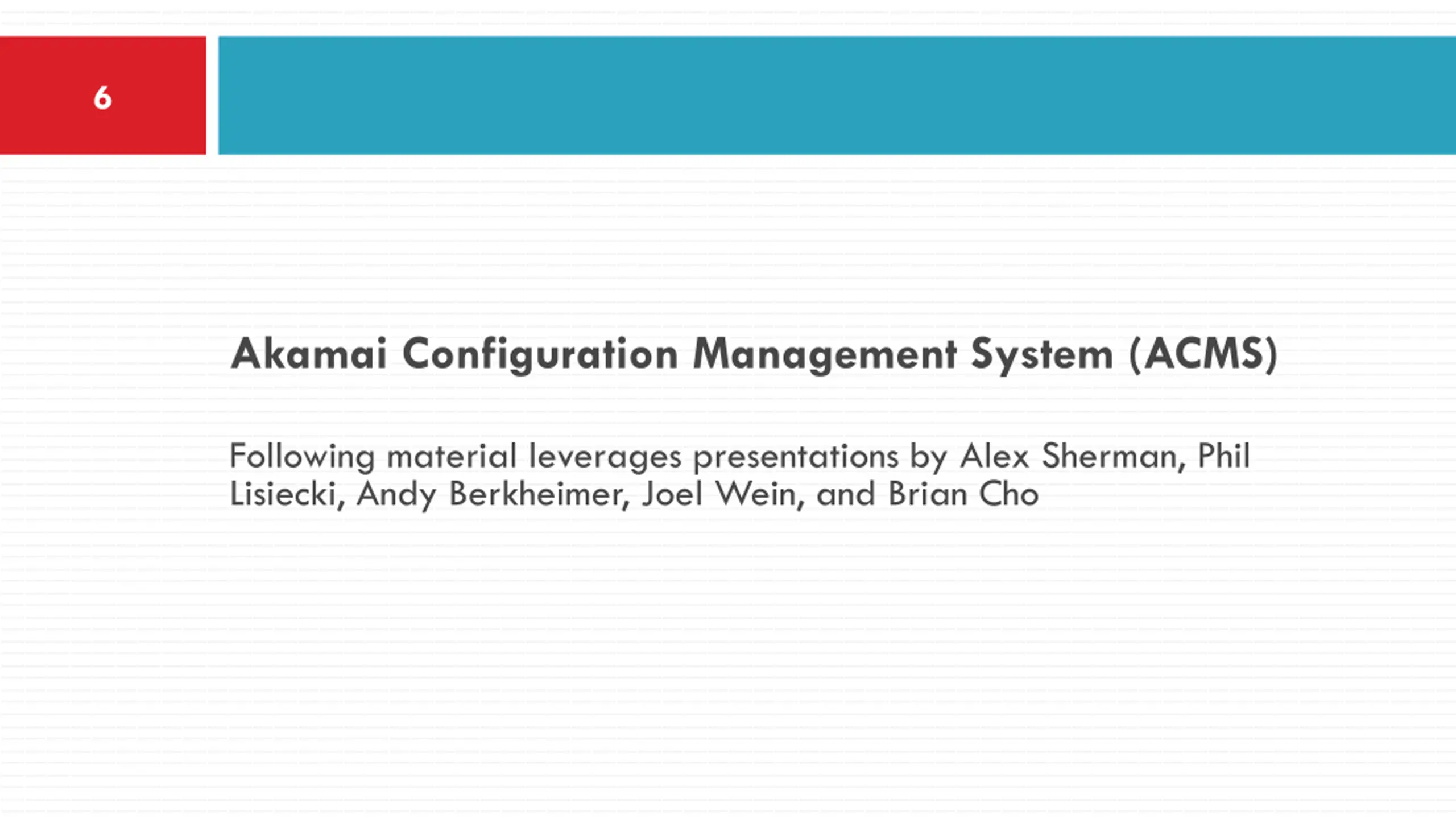 6 Akamai Configuration Management System (ACMS) Following material leverages presentations by Alex Sherman, Phil Lisiecki, Andy Berkheimer, Joel Wein, and Brian Cho