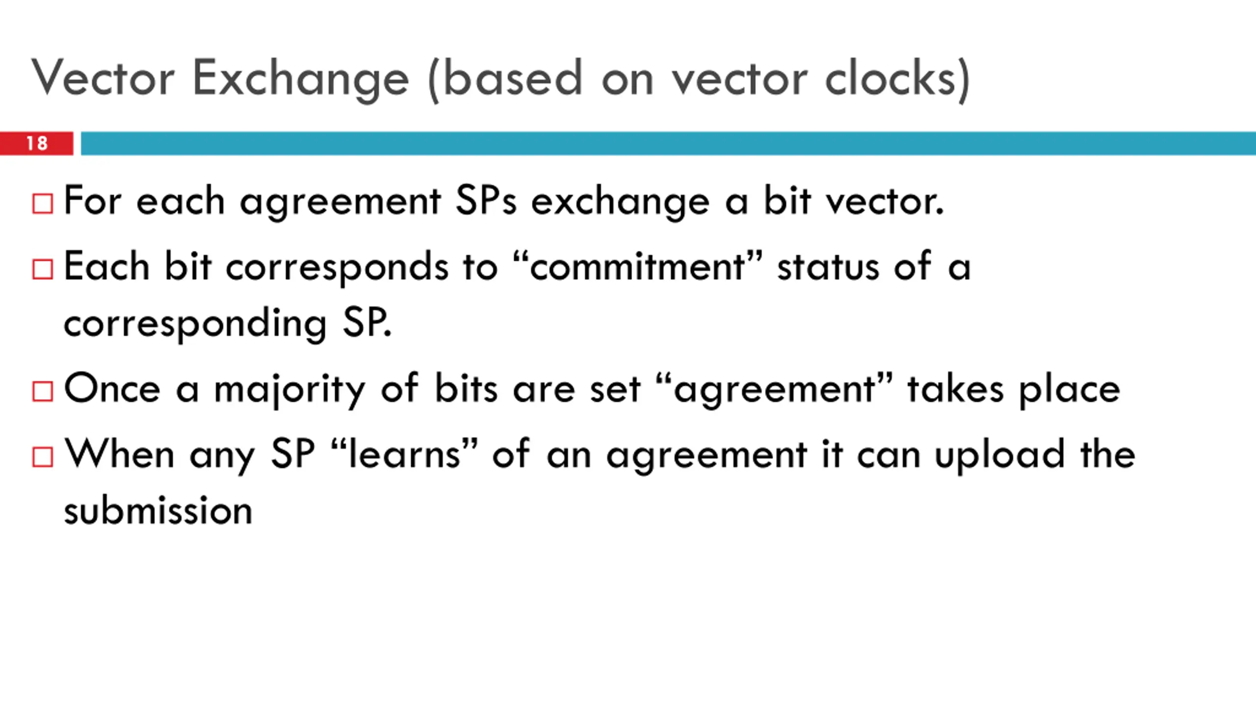 Vector Exchange (based on vector clocks) 18 For each agreement SPs exchange a bit vector. Each bit corresponds to commitment status of a corresponding SP. Once a majority of bits are set agreement takes place When any SP learns of an agreement it can upload the submission