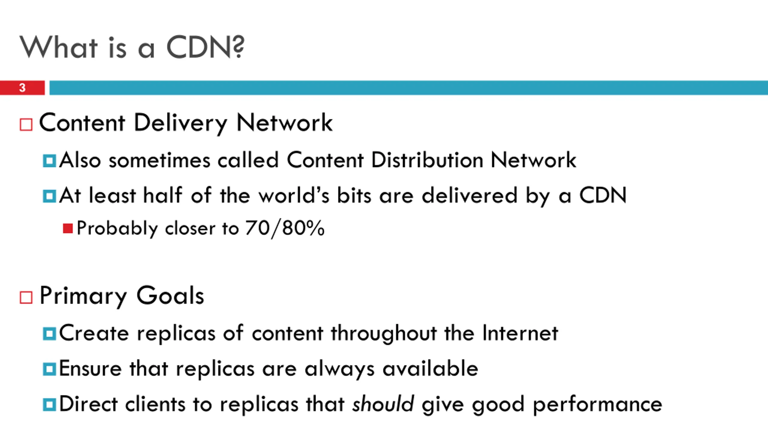 What is a CDN? 3 Content Delivery Network Also sometimes called Content Distribution Network At least half of the world s bits are delivered by a CDN Probably closer to 70/80% Primary Goals Create replicas of content throughout the Internet Ensure that replicas are always available Direct clients to replicas that should give good performance