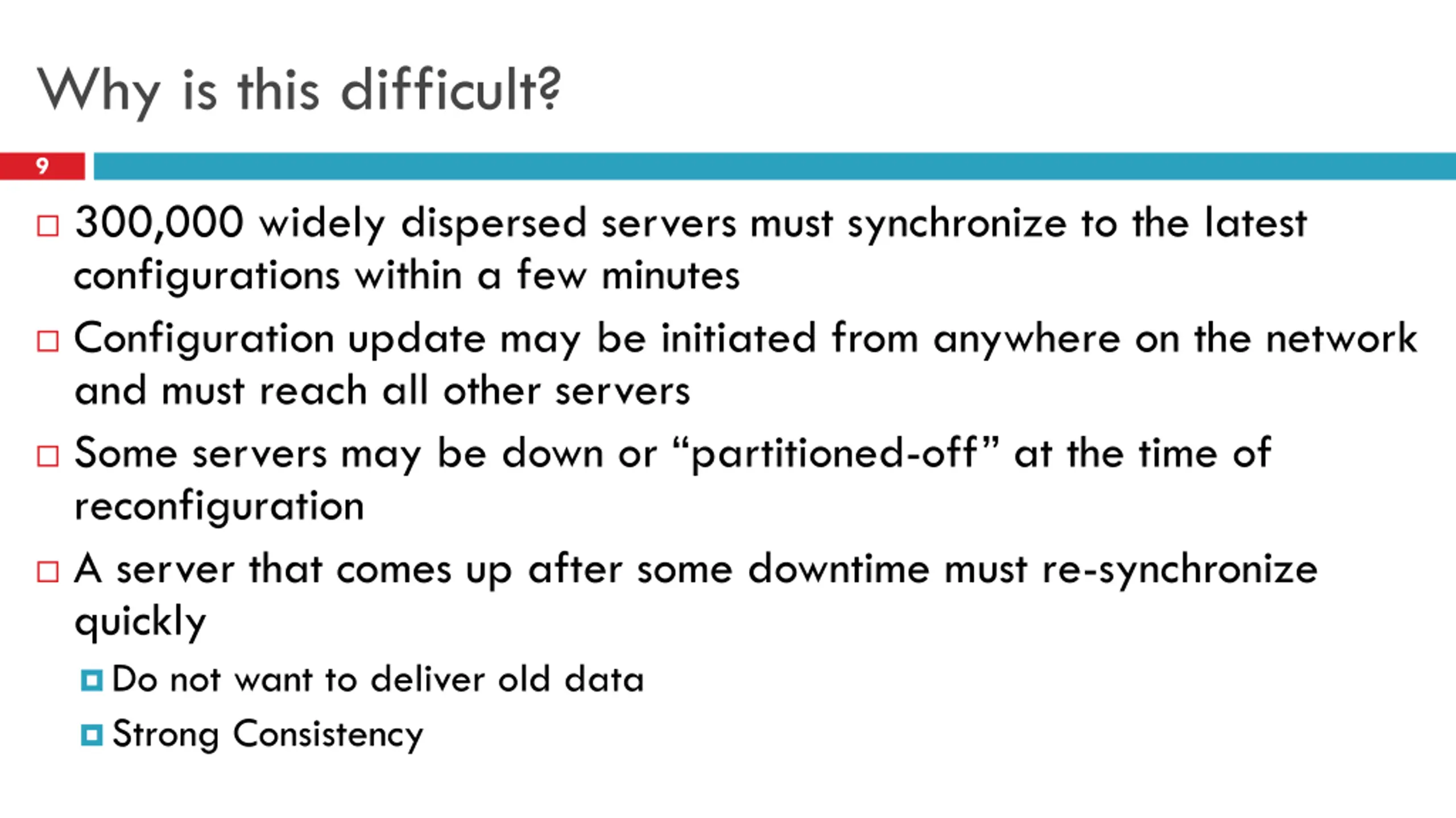 Why is this difficult? 9 300,000 widely dispersed servers must synchronize to the latest configurations within a few minutes Configuration update may be initiated from anywhere on the network and must reach all other servers Some servers may be down or partitioned-off at the time of reconfiguration A server that comes up after some downtime must re-synchronize quickly Do not want to deliver old data Strong Consistency