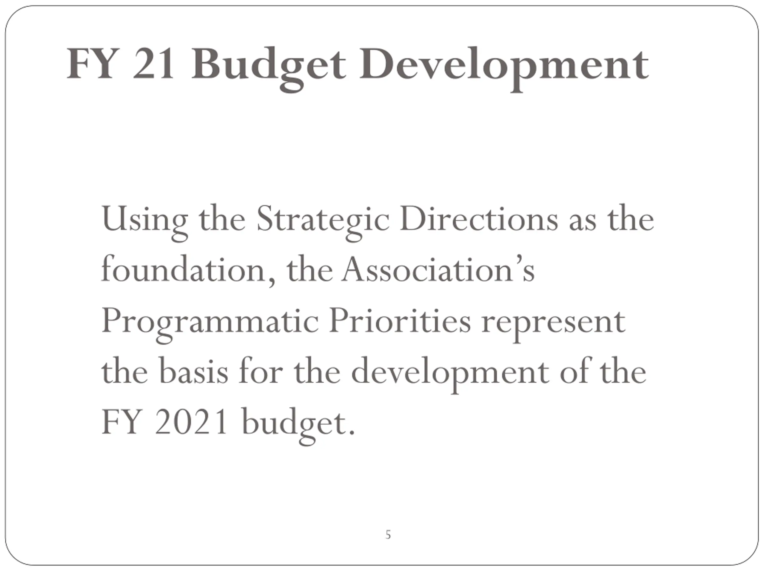 FY 21 Budget Development Using the Strategic Directions as the foundation, the Association s Programmatic Priorities represent the basis for the development of the FY 2021 budget. 5