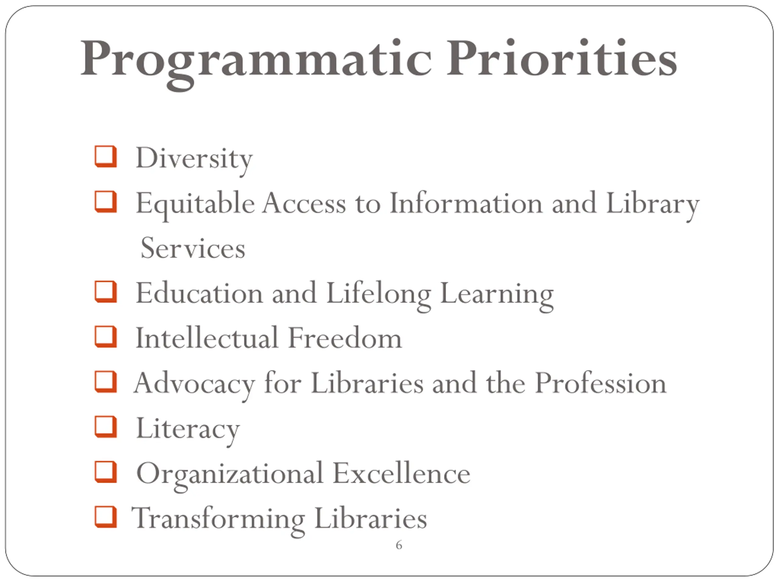 Programmatic Priorities Diversity Equitable Access to Information and Library Services Education and Lifelong Learning Intellectual Freedom Advocacy for Libraries and the Profession Literacy Organizational Excellence Transforming Libraries 6