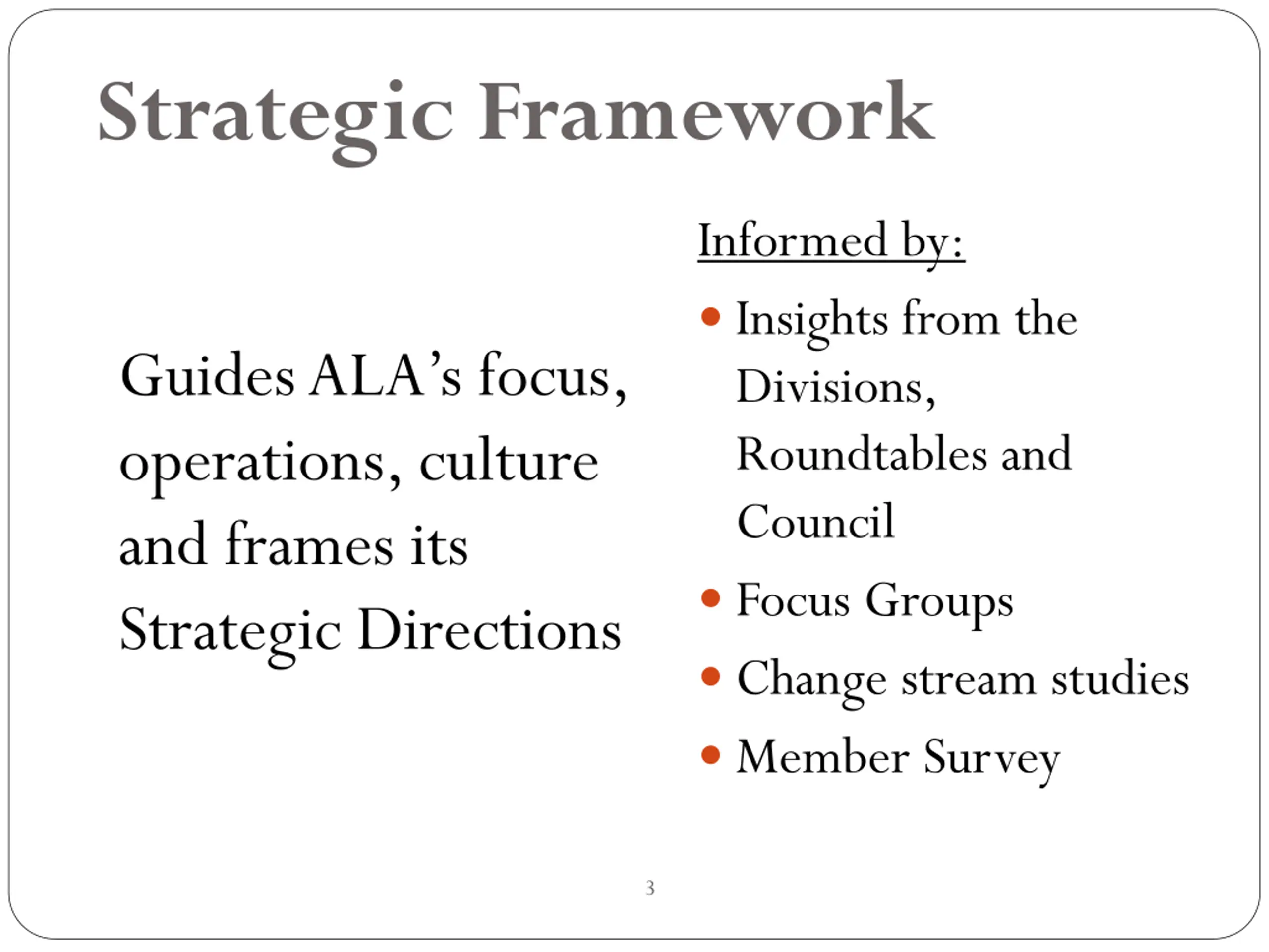 Strategic Framework Informed by: Insights from the Divisions, Roundtables and Council Focus Groups Change stream studies Member Survey Guides ALA s focus, operations, culture and frames its Strategic Directions 3