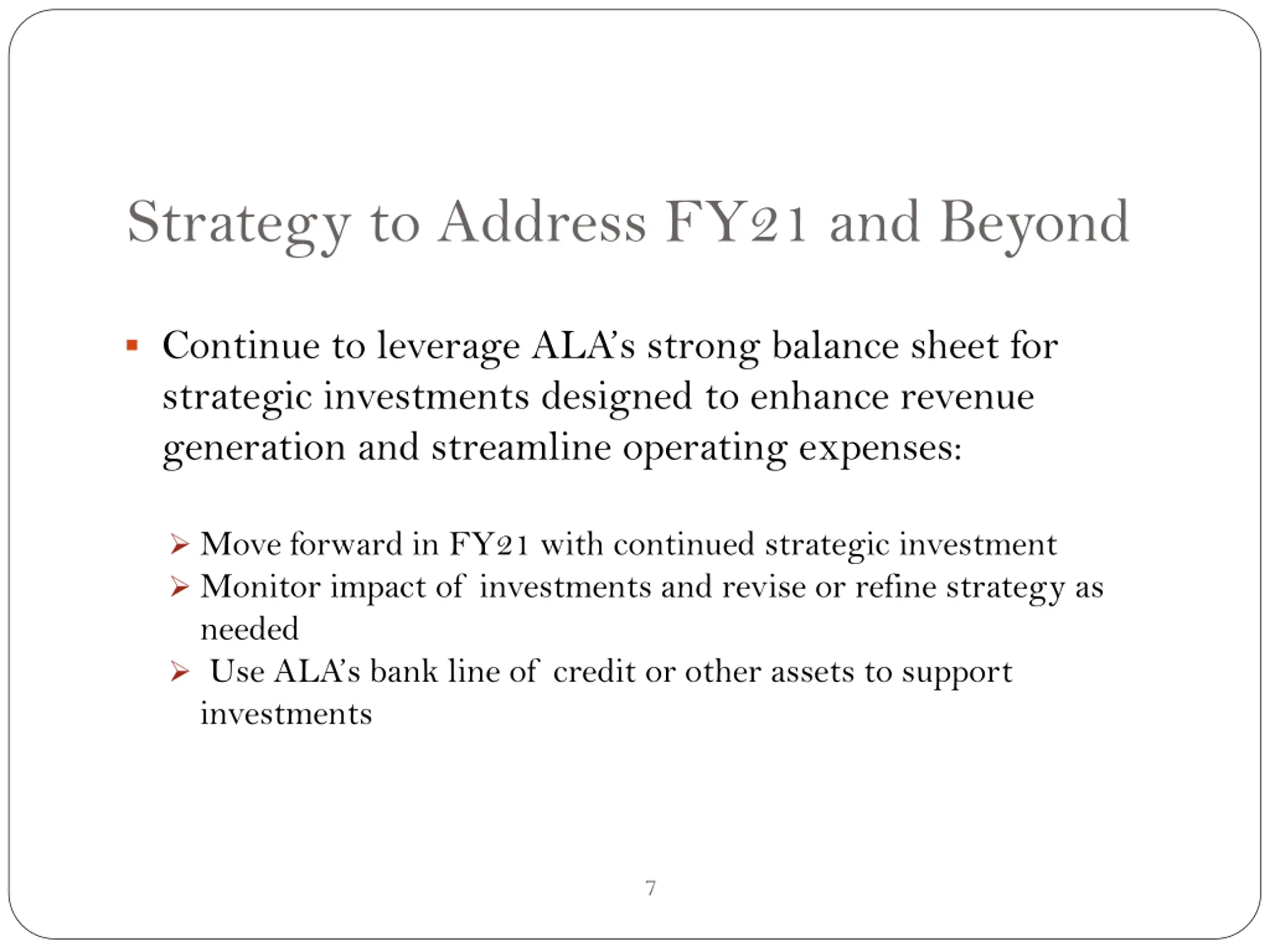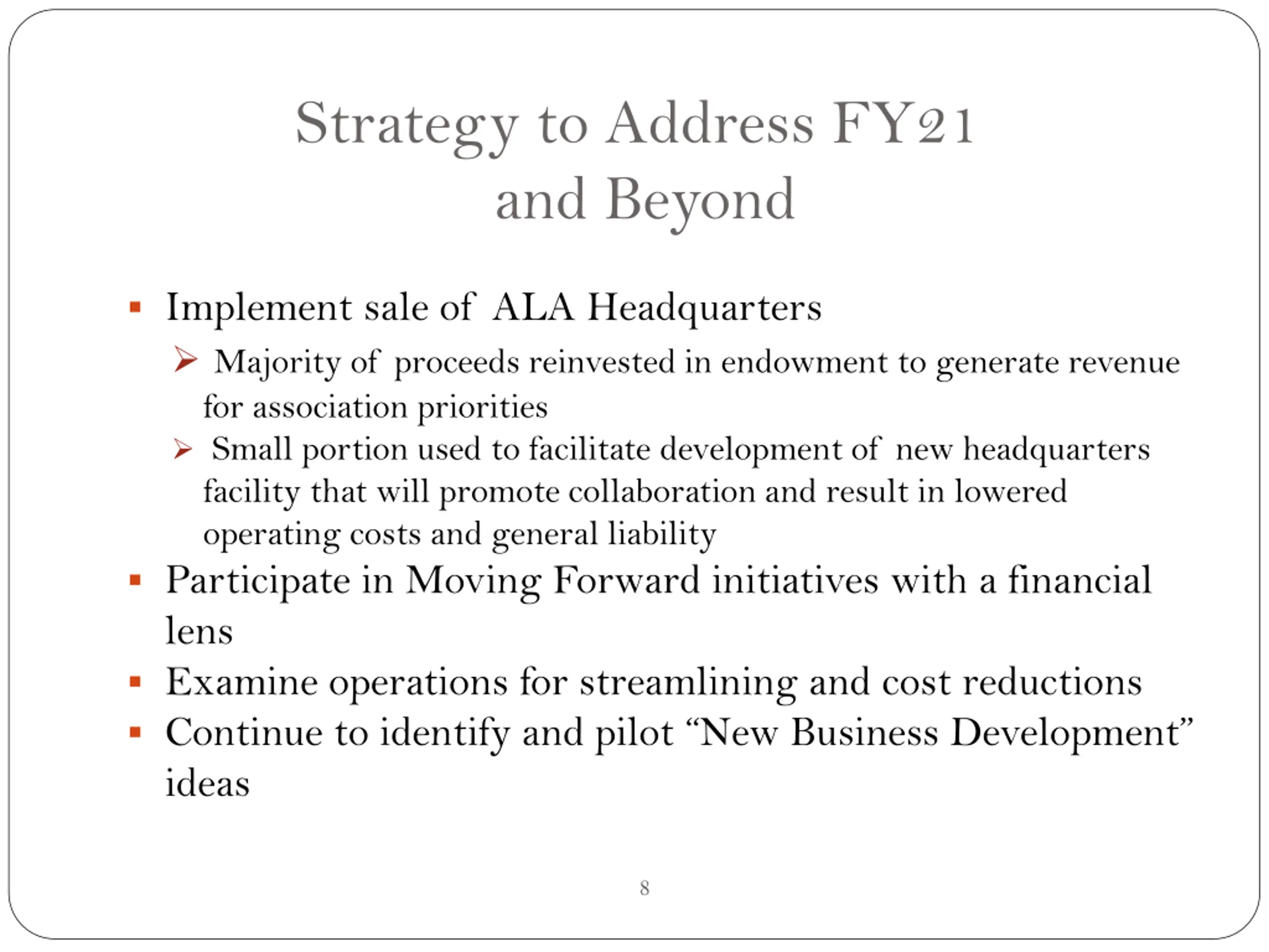Strategy to Address FY21 and Beyond Continue to leverage ALA s strong balance sheet for strategic investments designed to enhance revenue generation and streamline operating expenses: Move forward in FY21 with continued strategic investment Monitor impact of investments and revise or refine strategy as needed Use ALA s bank line of credit or other assets to support investments 7