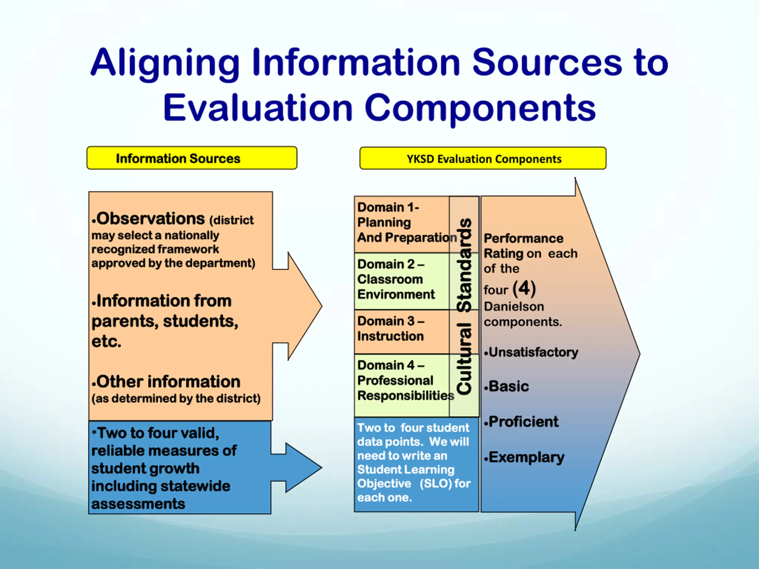 Aligning Information Sources to Evaluation Components Information Sources Information Sources YKSD Evaluation Components Domain 1 Domain 1- - Planning Planning And Preparation And Preparation Observations Observations (district may select a nationally may select a nationally recognized framework recognized framework approved by the department) approved by the department) (district Cultural Standards Cultural Standards Performance Performance Rating Rating on each of the four (4 4) Danielson components. Domain Domain 2 2 Classroom Classroom Environment Environment Information from Information from parents, students, parents, students, etc. etc. Domain Domain 3 3 Instruction Instruction Unsatisfactory Unsatisfactory Domain 4 Domain 4 Professional Professional Responsibilities Responsibilities Other information Other information (as determined by the district) (as determined by the district) Basic Basic Proficient Proficient Two to four student Two to four student data points. We will data points. We will need to write an need to write an Student Learning Student Learning Objective (SLO) for Objective (SLO) for each one. each one. *Two to four valid, Two to four valid, reliable measures of reliable measures of student growth student growth including including statewide statewide assessments assessments Exemplary Exemplary