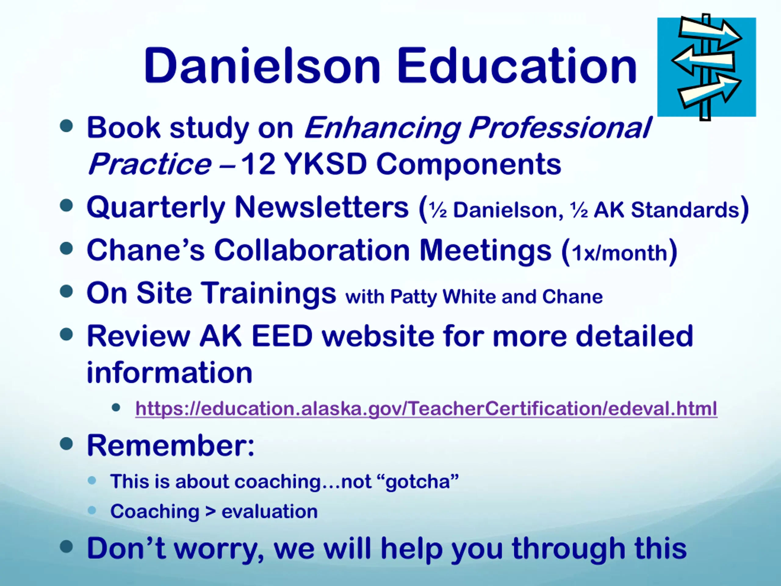 Danielson Education Book study on Enhancing Professional Practice 12 YKSD Components Quarterly Newsletters ( Danielson, AK Standards) Chane s Collaboration Meetings (1x/month) On Site Trainings with Patty White and Chane Review AK EED website for more detailed information https://education.alaska.gov/TeacherCertification/edeval.html Remember: This is about coaching not gotcha Coaching > evaluation Don t worry, we will help you through this