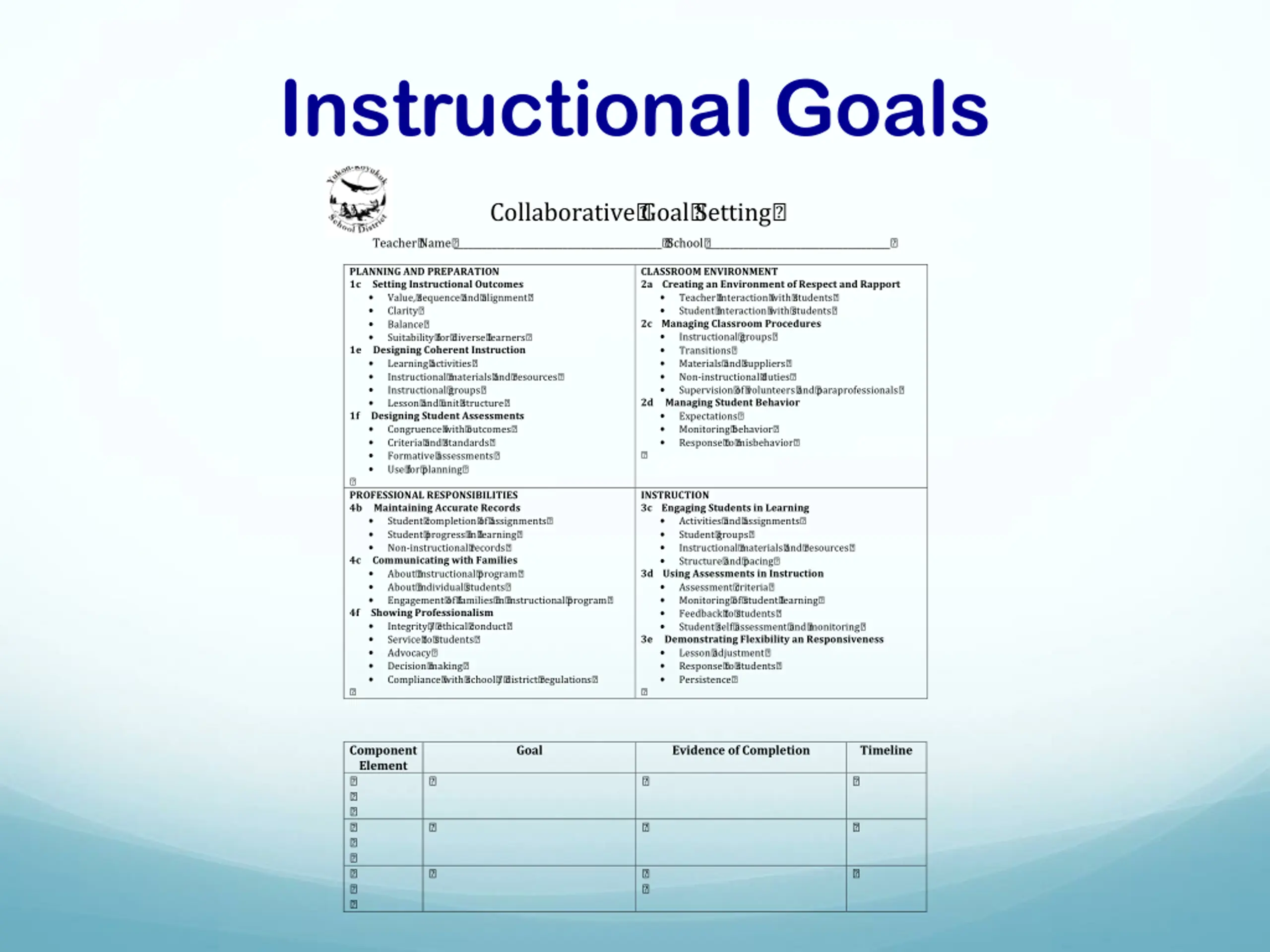 Instructional Goals Collaborative? Goal? Setting? Teacher? Name? ____________________________________________? ? School? _______________________________________? PLANNING?AND?PREPARATION? 1c?????Setting?Instructional?Outcomes? Value,? sequence? and? alignment? Clarity? Balance? Suitability? for? diverse? learners? 1e?????Designing?Coherent?Instruction? Learning? activities? Instructional? materials? and? resources? Instructional? groups? Lesson? and? unit? structure? 1f?????Designing?Student?Assessments? Congruence? with? outcomes? Criteria? and? standards? Formative? assessments? Use? for? planning? ? PROFESSIONAL?RESPONSIBILITIES? 4b?????Maintaining?Accurate?Records? Student? completion? of? assignments? Student? progress? in? learning? Non-instructional? records? 4c?????Communicating?with?Families? About? instructional? program? About? individual? students? Engagement? of? families? in? instructional? program? 4f?????Showing?Professionalism? Integrity? /? ethical? conduct? Service? to? students? Advocacy? Decision? making? Compliance? with? school? /? district? regulations? ? CLASSROOM?ENVIRONMENT? 2a????Creating?an?Environment?of?Respect?and?Rapport? Teacher? interaction? with? students? Student? interaction? with? students? 2c????Managing?Classroom?Procedures? Instructional? groups? Transitions? Materials? and? suppliers? Non-instructional? duties? Supervision? of? volunteers? and? paraprofessionals? 2d?????Managing?Student?Behavior? Expectations? Monitoring? behavior? Response? to? misbehavior? ? INSTRUCTION? 3c????Engaging?Students?in?Learning? Activities? and? assignments? Student? groups? Instructional? materials? and? resources? Structure? and? pacing? 3d????Using?Assessments?in?Instruction? Assessment? criteria? Monitoring? of? student? learning? Feedback? to? students? Student? self? assessment? and? monitoring? 3e?????Demonstrating?Flexibility?an?Responsiveness? Lesson? adjustment? Response? to? students? Persistence? ? Component? Element? ? ? ? ? ? ? ? ? ? Goal? Evidence?of?Completion? Timeline? ? ? ? ? ? ? ? ? ? ? June? 2014?