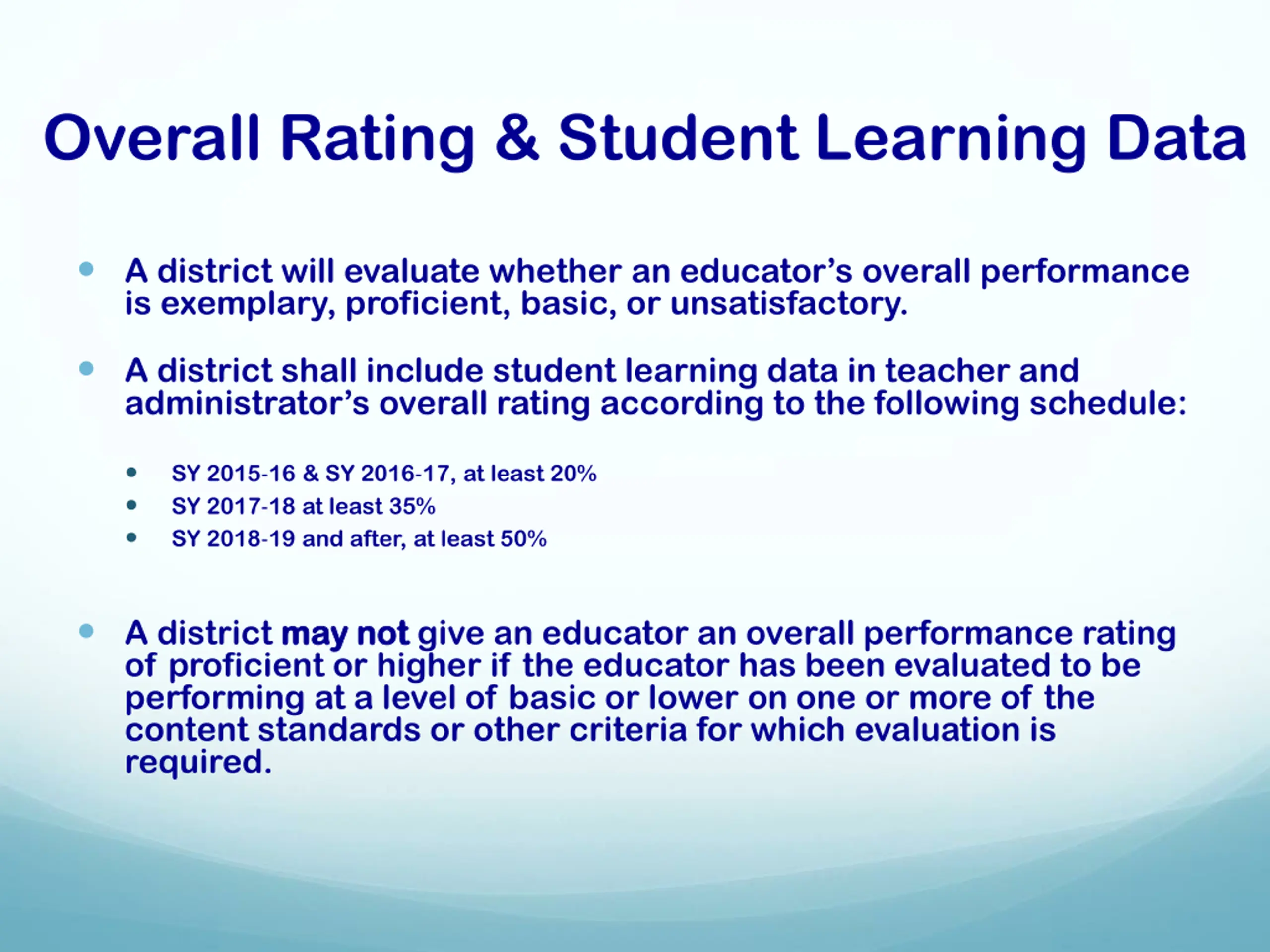 Overall Rating & Student Learning Data A district will evaluate whether an educator s overall performance is exemplary, proficient, basic, or unsatisfactory. A district shall include student learning data in teacher and administrator s overall rating according to the following schedule: SY 2015 16 & SY 2016 17, at least 20% SY 2017 18 at least 35% SY 2018 19 and after, at least 50% A district may not of proficient or higher if the educator has been evaluated to be performing at a level of basic or lower on one or more of the content standards or other criteria for which evaluation is required. may not give an educator an overall performance rating